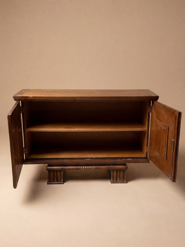 Ce buffet en chêne déploie une présence calme et assurée, où la rigueur de la construction s’adoucit au contact d’une patine profonde et vivante. La façade, organisée autour de deux portes, est animée par des panneaux en léger ressaut, chacun centré d’un motif carré sculpté, comme creusé dans la matière. Le bois, aux nuances brun chaud, laisse apparaître un veinage riche, irrégulier, presque pictural. Les variations de teinte, les zones plus claires du plateau, les usures subtiles aux arêtes témoignent du temps et participent pleinement à l’équilibre du meuble, lui donnant une dimension sensible et incarnée. Le piétement, composé de volumes cannelés reliés par une traverse cylindrique, introduit un rythme architectural qui contraste avec la douceur du plateau. L’ensemble évoque le travail de Pierre de la Londe, où la construction, le relief et la matière s’unissent dans une écriture à la fois sobre et profondément expressive.