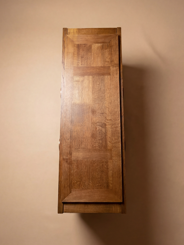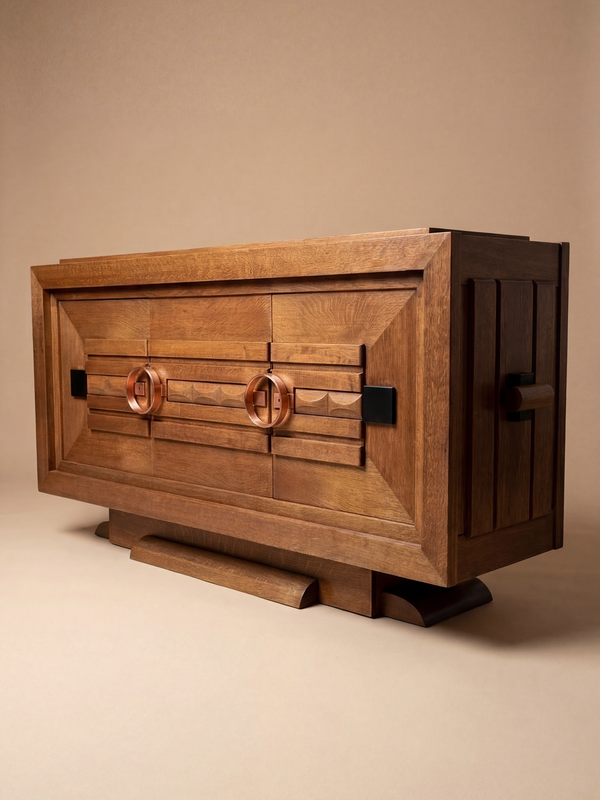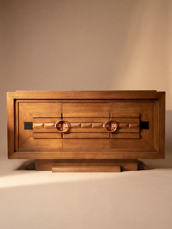 Une composition remarquable, structurée par une géométrie forte et un travail de menuiserie précis, qui illustre pleinement le langage singulier de l’Art Déco français. La façade est rythmée par des panneaux en relief et des motifs sculptés, lui conférant une présence architecturale affirmée. Attribué à Charles Dudouyt et édité par La Gentilhommière, ce buffet témoigne d’un équilibre subtil entre inspiration rustique et rigueur moderniste. Réalisé en chêne massif, il présente un veinage riche et a fait l’objet d’une restauration complète réalisée avec soin. L’intérieur offre un bel espace de rangement avec des étagères bien agencées et des tiroirs centraux. À la fois fonctionnel et sculptural, ce meuble incarne avec force l’élégance structurée du mobilier français des années 1930.