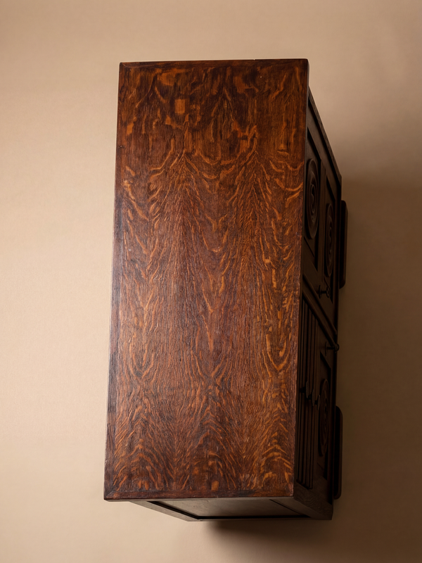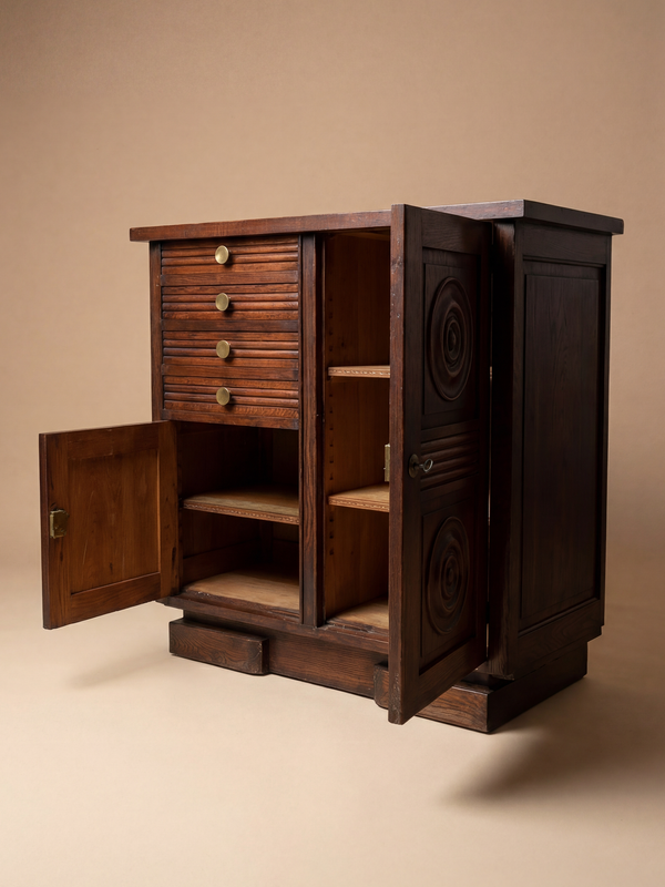 Ce meuble se distingue par une composition structurée et expressive, mêlant sobriété des volumes et richesse du travail du bois. Le chêne, profond et chaleureux, révèle une belle patine mettant en valeur chaque détail. La façade est rythmée par des panneaux sculptés en relief et une série de tiroirs aux poignées en laiton, créant un jeu graphique typique du style régionaliste des années 1930. L’ensemble dégage une présence à la fois robuste et décorative. À l’intérieur, l’aménagement offre un rangement fonctionnel avec étagères et compartiments. Une pièce de caractère, idéale pour apporter une touche authentique et architecturée à un intérieur.