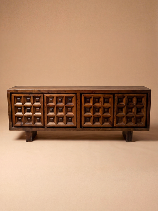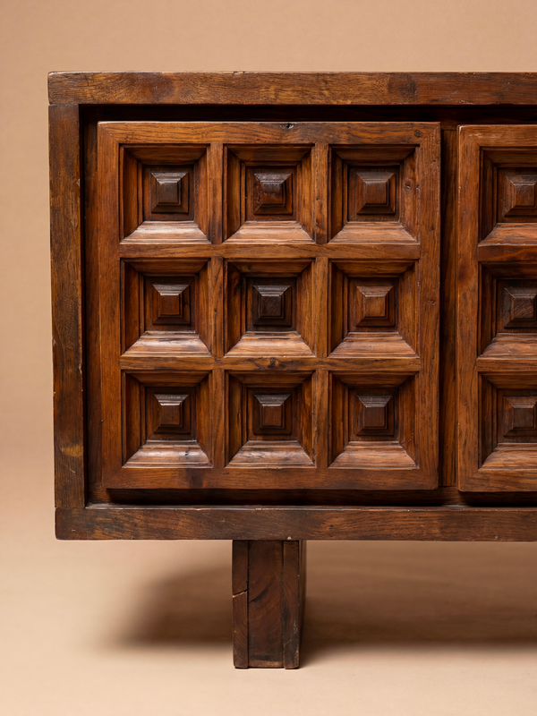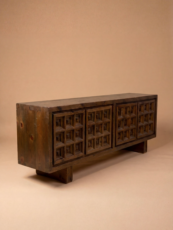 Ce buffet est une œuvre caractéristique de Biosca, dont la production en Espagne dans les années 1950–1960 se distinguait par sa rigueur silencieuse et par une interprétation singulière du modernisme. Les meubles de Biosca développent un langage qui conjugue discipline architecturale et sens aigu de la matière et du savoir-faire, situant son travail à la croisée des principes du modernisme international et d’une solidité profondément ibérique. Le meuble est réalisé en pin massif, avec un long caisson rectiligne reposant sur des pieds blocs robustes et légèrement en retrait, qui confèrent au buffet une présence à la fois stable et volontaire. La façade est rythmée par une succession de panneaux carrés profondément sculptés, organisés selon une trame rigoureuse. Chaque panneau est travaillé en relief, créant un jeu d’ombres et de lumières qui anime la surface sans recourir à un décor rapporté. Ce relief géométrique, architectural dans son esprit, évoque à la fois les plafonds à caissons et la sculpture abstraite en bas-relief, un thème récurrent dans l’œuvre de Biosca. Le plateau est volontairement laissé sobre, soulignant le contraste entre le plan horizontal lisse et la densité sculpturale des portes. De subtiles variations du veinage et de la patine du bois témoignent de l’âge et de l’authenticité du matériau, tout en renforçant la sensation de masse et de permanence qui caractérise la pièce. Vue en perspective, la profondeur de la sculpture apparaît avec évidence, mettant en valeur la maîtrise technique requise pour sa réalisation. À la fois fonctionnel et expressif, ce buffet illustre la capacité de Biosca à transformer un meuble de rangement en un objet composé, presque monumental, qui trouve naturellement sa place aussi bien dans un intérieur raffiné que dans une collection exigeante consacrée au design européen de l’après-guerre.