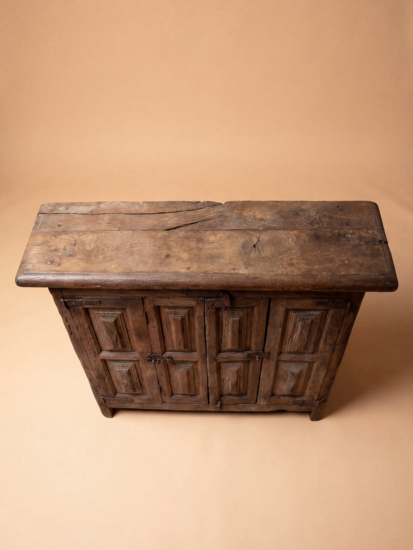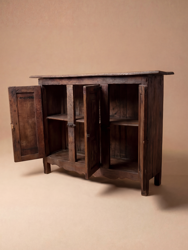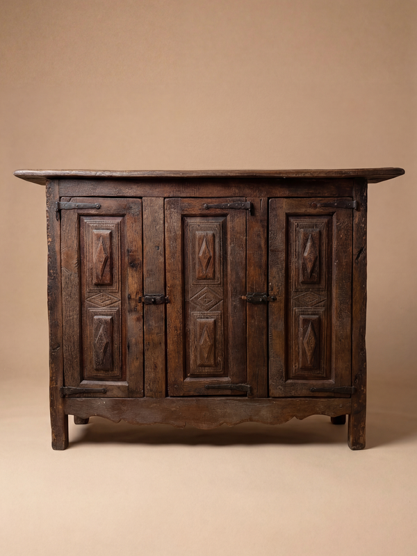 Ce buffet en chêne incarne la simplicité expressive du mobilier rural français du XIXe siècle. Sa façade à quatre portes est animée par un décor sculpté de panneaux à motifs géométriques, naïfs et profondément ancrés dans une tradition vernaculaire. Les ferrures en fer forgé, aux formes rudimentaires, renforcent le caractère authentique de l’ensemble. Le bois, marqué par le temps, révèle une patine dense et vibrante, faite de nuances brunes, d’usures et d’irrégularités qui témoignent de son usage quotidien. Le plateau, large et légèrement déformé, conserve les traces d’une vie domestique, apportant une dimension presque tactile à la pièce. À la fois fonctionnel et profondément sculptural, ce meuble dégage une présence sincère et intemporelle, où la main de l’artisan reste perceptible dans chaque détail.