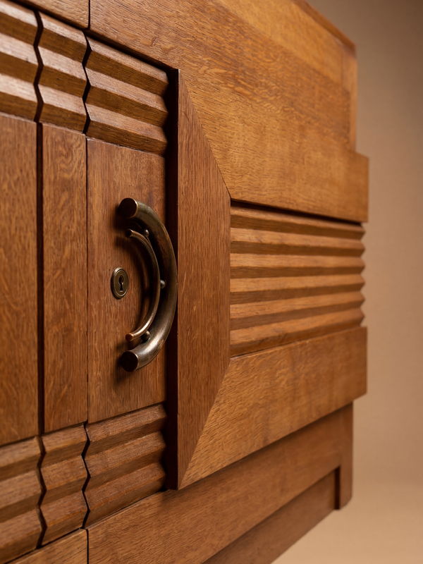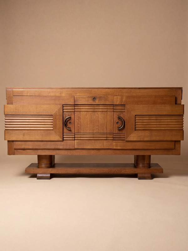 Ce buffet en chêne présente une architecture puissante et équilibrée, caractéristique du vocabulaire de Charles Dudouyt. La façade est structurée par un jeu de volumes en léger relief, souligné par des cannelures horizontales et des encadrements épais qui rythment la composition avec précision. Les portes latérales, en saillie, encadrent un corps central plus sobre, créant un contraste subtil entre densité décorative et rigueur géométrique. Les poignées en métal, aux lignes courbes, apportent une touche de douceur et dialoguent avec la structure anguleuse de l’ensemble. Le chêne, aux tonalités chaudes et lumineuses, révèle un veinage fin et régulier, mis en valeur par une patine douce et homogène. Le piétement, composé de deux supports cylindriques reposant sur une base étagée, ancre le meuble avec stabilité tout en lui conférant une présence sculpturale affirmée.