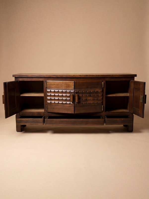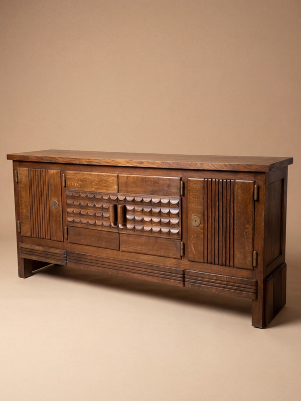 Ce buffet en chêne, signé au fer chaud par Charles Dudouyt et édité par La Gentilhommière, illustre avec force le vocabulaire du modernisme régionaliste français des années 1930–1940. Sa silhouette étirée et horizontale, associée à des proportions puissantes, lui confère une présence architecturale affirmée, ancrée dans la solidité et la fonction. La composition s’organise autour d’une paire de portes centrales sculptées, véritables points focaux du meuble. Leur décor géométrique profondément creusé, rythmé et tactile, est emblématique du langage formel de Dudouyt. Les portes latérales cannelées et les poignées en bois massif prolongent cette écriture sobre, équilibrant ornement et lisibilité structurelle. Entièrement réalisé en chêne massif, le buffet révèle une grande qualité d’exécution à travers l’épaisseur des panneaux, la précision des assemblages et le piètement étagé. À la fois fonctionnel et sculptural, il traduit la recherche de Dudouyt pour une synthèse entre tradition artisanale, monumentalité et modernité décorative mesurée.