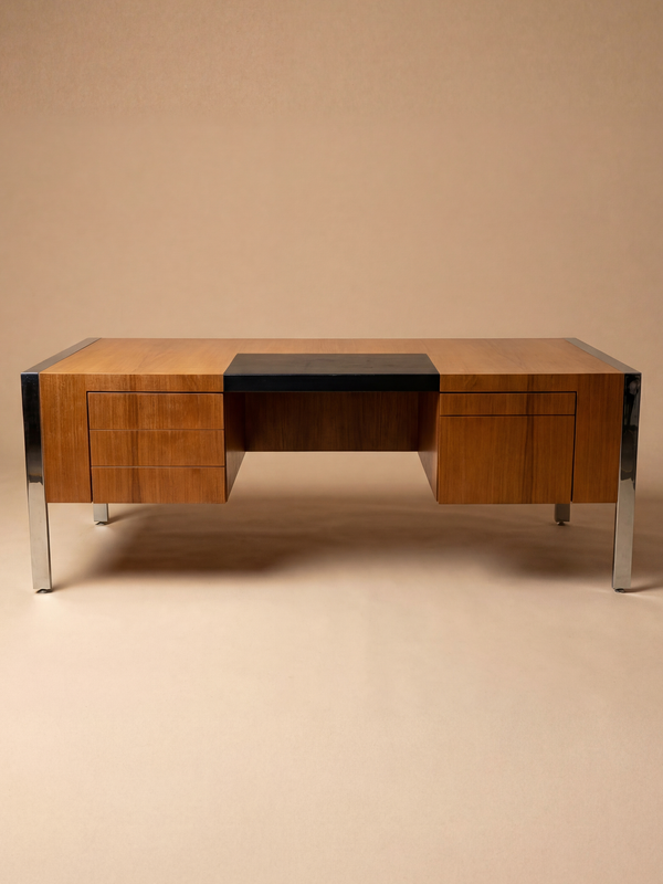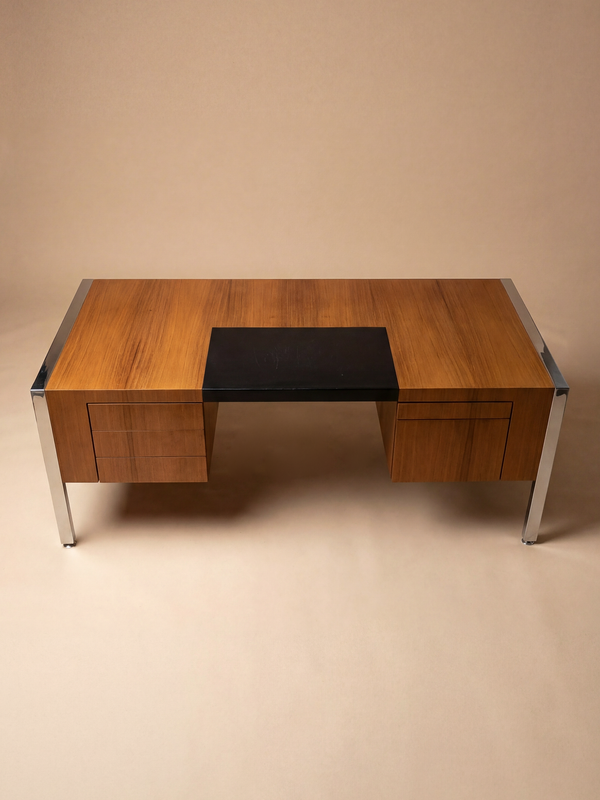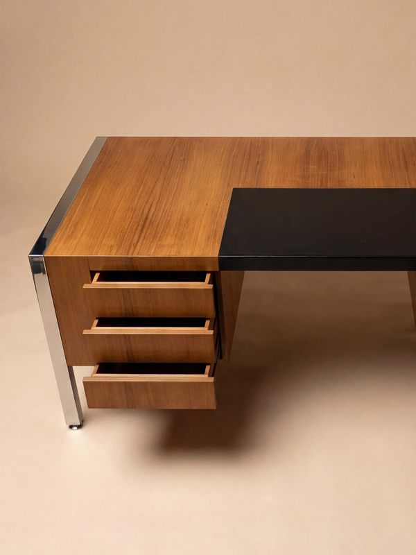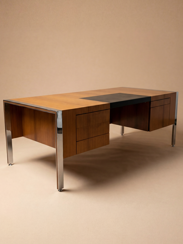 Exemple emblématique de la pensée du design français d’après-guerre appliquée aux espaces de direction, le bureau Direction Prestige de Joseph-André Motte a été conçu en 1962 pour Dassas. Imprégné de la clarté intellectuelle et de la rigueur fonctionnelle propres à l’œuvre de Motte, ce bureau monumental associe des matériaux raffinés à une silhouette moderne, sobre et maîtrisée. La structure repose sur un dialogue précis entre un placage de bois chaleureux et le métal chromé aux reflets lumineux. Le large plateau rectangulaire, ponctué d’un discret sous-main intégré en cuir sombre, s’étire latéralement entre deux volumes porteurs équilibrés. Ceux-ci intègrent des éléments de rangement fonctionnels tout en préservant la forte horizontalité de l’ensemble. Le cadre en acier chromé dessine un contour net et architectural autour du plateau, soulignant ses arêtes avec précision et mettant subtilement en valeur le veinage naturel du bois. Conçu à une échelle généreuse, en adéquation avec sa fonction « directionnelle », ce bureau est pensé pour les espaces de pouvoir, où l’autorité s’exprime par la proportion et la matière plutôt que par l’ornement. Sa géométrie rigoureuse, la lisibilité de sa construction et l’équilibre soigneusement dosé entre solidité et légèreté traduisent pleinement les idéaux du modernisme français du début des années 1960. Au sein de l’œuvre de Joseph-André Motte, reconnue pour sa capacité à conjuguer savoir-faire traditionnel et procédés industriels contemporains, ce bureau s’impose comme une pièce aboutie et affirmée. Il incarne une vision du mobilier de direction à la fois fonctionnelle et maîtrisée, alliant confort, prestige et une élégance mesurée qui demeure aujourd’hui d’une grande modernité.