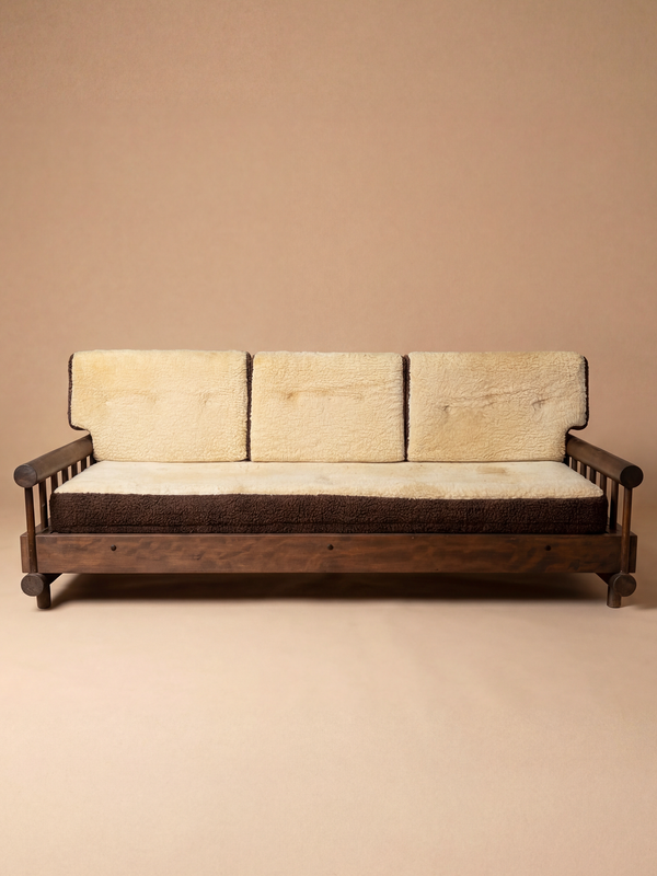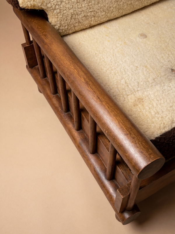Ce canapé « La Cachette », réalisé en France vers 1960, s’inscrit dans le contexte de l’aménagement de l’hôtel La Cachette, dont le décor intérieur fut conçu par Charlotte Perriand. Il témoigne de l’esthétique moderniste et fonctionnelle qui caractérise cet ensemble, sans pouvoir être attribué directement à la designer. Son profil bas et étiré affirme une forte horizontalité, évoquant à la fois la stabilité et l’idée d’abri suggérée par le nom du lieu. La structure en bois massif est entièrement lisible : traverses arrondies, barreaux verticaux et assemblages soigneusement proportionnés traduisent une recherche de simplicité et de cohérence constructive. Observé sous tous les angles, ce canapé évoque une forme de micro-architecture domestique, pensée pour durer : solide, rationnelle et profondément ancrée dans l’esprit du modernisme français de l’après-guerre. Le canapé est présenté avec ses coussins d’origine ; toutefois, une réfection de la tapisserie est à prévoir. Notre atelier interne peut se charger d’une restauration complète, en proposant des choix de tissus respectueux de l’époque et du caractère architectural de la pièce.