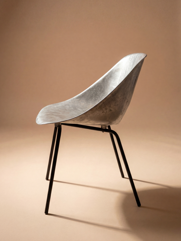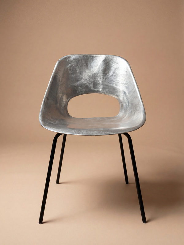 Une assise sculpturale au dessin fluide, marquée par une élégance résolument moderne. La coque en aluminium, à la surface subtilement texturée, capte la lumière et souligne la douceur de ses courbes. Le dossier ajouré allège la silhouette tout en lui conférant une identité graphique forte. Reposant sur un piétement fin en métal noir, l’ensemble conjugue légèreté visuelle et rigueur structurelle. Un bel exemple du design français d’après-guerre, alliant innovation, confort et présence matérielle, idéal dans un intérieur contemporain ou éclectique.