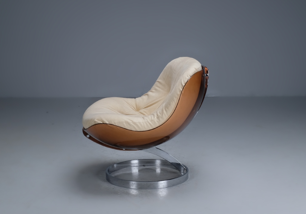Il y a une différence significative entre s'asseoir et flotter avec cette chaise longue emblématique fabriquée dans les années 1970. Cette pièce vous invite à vous reposer sur son coussin original en nubuck, niché dans une coque semi-sphérique classique en plexiglas fumé. Les tons chaleureux, ainsi que la texture de son rembourrage, font de cette chaise une expérience douce tant pour les yeux que pour le contact d'un corps détendu. Le piètement en métal chromé, composé d'une forme circulaire et d'une colonne inclinée qui ressemble plus à une suspension dans l'air qu'à un support, représente l'une des signatures du designer Boris Tabacoff, qui a réalisé ce fauteuil dans le cadre d'une collection originale pour Mobilier Modulaire Morderne.