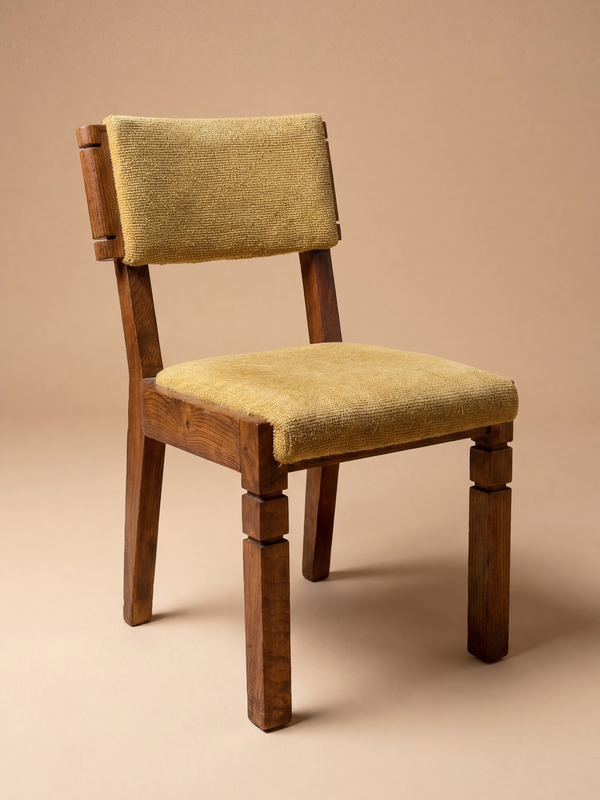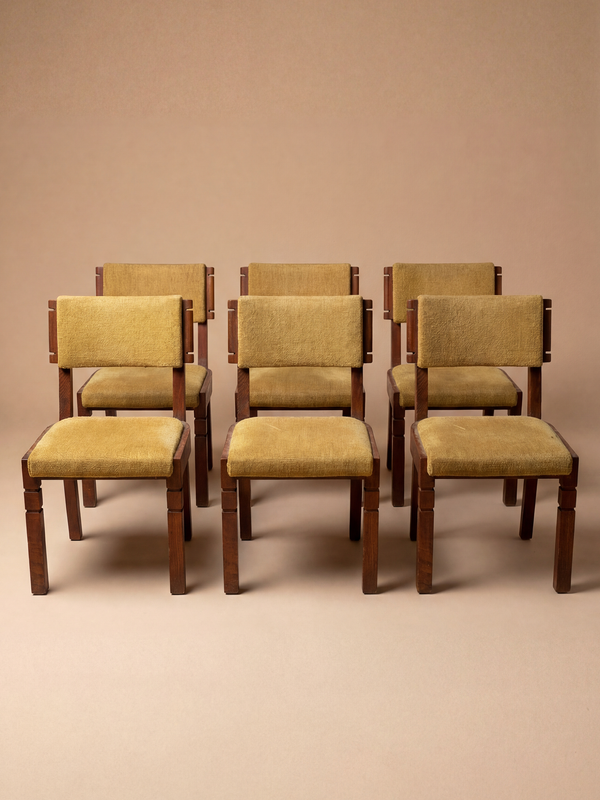 Ces pièces illustrent parfaitement le langage robuste et structuré du designer, où la simplicité des volumes s’enrichit d’un travail subtil sur les sections et les assemblages. La structure en chêne massif, aux lignes franches et aux pieds rythmés par des ressauts géométriques, affirme une présence à la fois rustique et moderniste. Le dossier légèrement incliné et l’assise généreuse offrent un confort équilibré, tandis que le velours moutarde apporte une touche chaleureuse et lumineuse. Le tissu est en bon état d’usage, avec une patine cohérente avec son âge, mais une réfection pourrait être envisagée pour un rendu optimal. Notre atelier peut prendre en charge la retapisserie sur demande, en respectant l’esprit d’origine. Chaises signées.