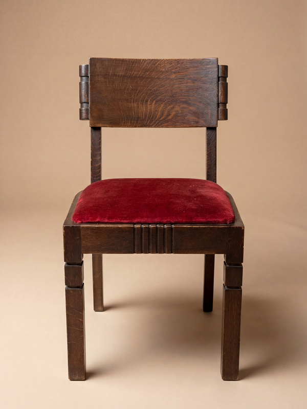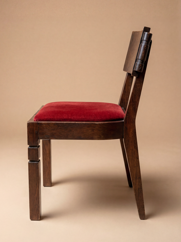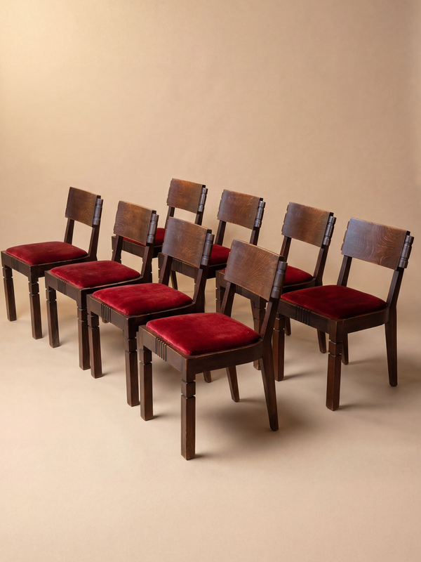 Cet ensemble de huit chaises constitue un témoignage particulièrement abouti du travail de Charles Dudouyt dans les années 1940, édité par La Gentilhommière, l’un des principaux diffuseurs de son œuvre. Il s’inscrit dans la période où Dudouyt affirme pleinement un langage formel devenu emblématique, à la croisée des traditions régionales françaises, d’une construction rigoureuse et d’un modernisme volontairement dépourvu de tout superflu décoratif. Réalisées en chêne massif, les chaises présentent une silhouette compacte et solidement ancrée. Les pieds droits, volontairement robustes, sont animés de légers décrochements qui accentuent leur caractère architectural. La traverse avant de l’assise est rythmée par un décor de cannelures verticales, motif récurrent chez Dudouyt, utilisé ici comme un élément de structure visuelle plus que comme ornement. Les dossiers sont composés d’une large traverse pleine, maintenue latéralement par des assemblages cylindriques apparents, soulignant la franchise de la construction et la mise en valeur du matériau. Les proportions sont mesurées et cohérentes. Présentées en ensemble, les chaises forment une composition disciplinée et homogène ; prises individuellement, elles révèlent une présence sculpturale discrète mais affirmée. Le dossier légèrement incliné et l’assise généreusement garnie assurent un confort réel, tandis que la structure reste parfaitement lisible. Le velours rouge profond des assises crée un contraste chaleureux avec la patine sombre du chêne, enrichissant l’ensemble sans détourner l’attention du travail du bois. Plusieurs chaises portent la signature au fer chaud caractéristique de Dudouyt, apposée directement sur le chêne. Ce marquage, à la fois brut et définitif, constitue un gage d’authenticité et reflète la philosophie du créateur : un mobilier sincère, durable et profondément ancré dans l’idée de savoir-faire. Cet ensemble incarne pleinement la vision de Dudouyt : un mobilier fonctionnel et rigoureux, enraciné dans la tradition française tout en exprimant une modernité sobre, pensé pour traverser le temps.