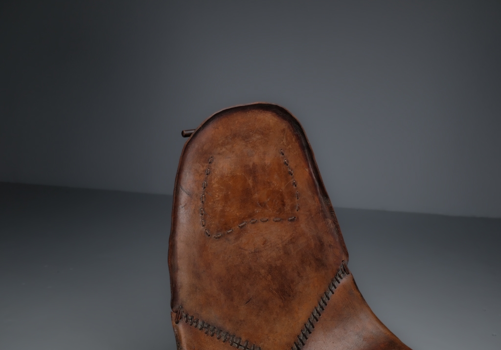 Ce fauteuil brésilien incarne la richesse du mouvement décoratif rustique brutaliste des années 1950 au Brésil, qui a connu son apogée avec le travail d'architectes tels que Zanine Caldas. Il est composé d'une structure tripode en bois qui maintient en suspension l'assise en cuir épais. Son potentiel décoratif est énorme. Le cuir est en très bon état, sa riche patine donnera force et cohérence à un environnement wabi sabi.