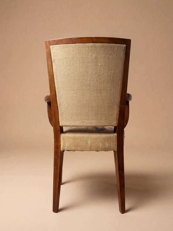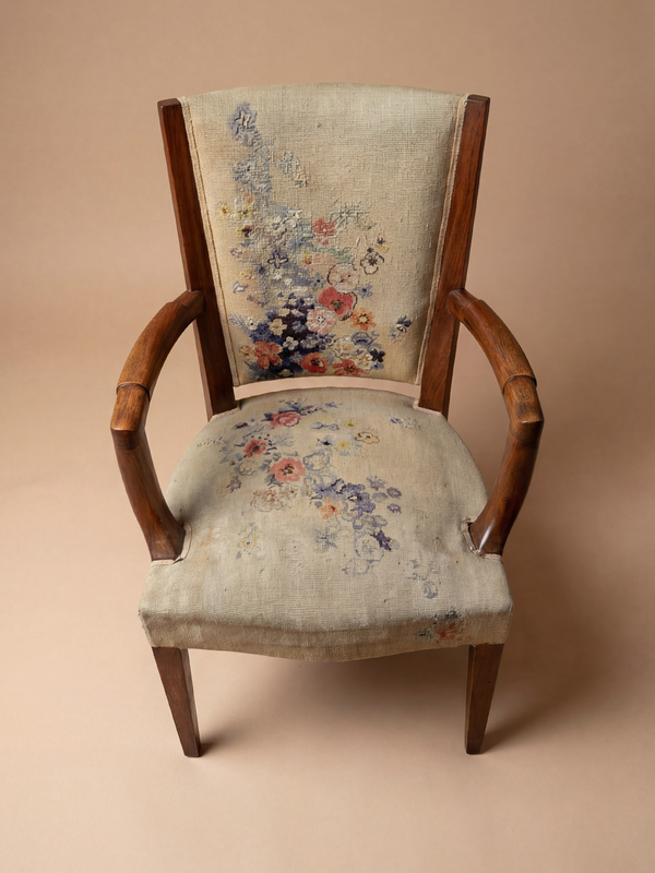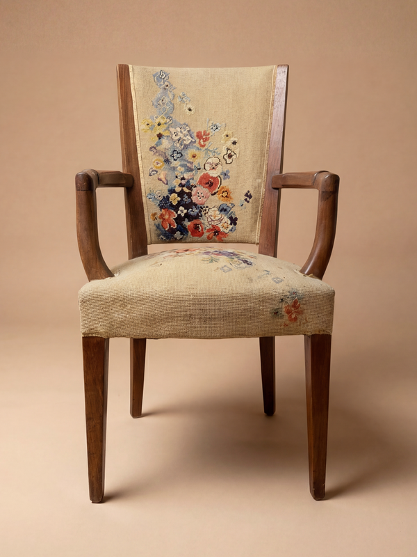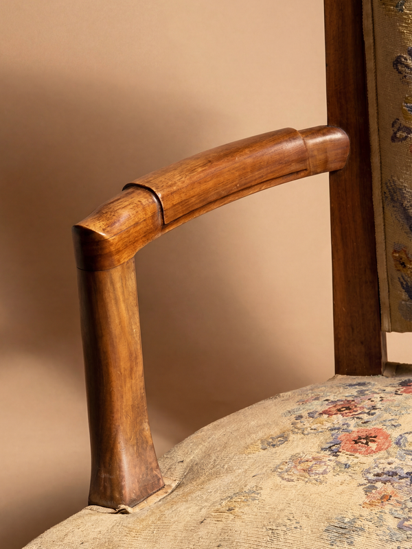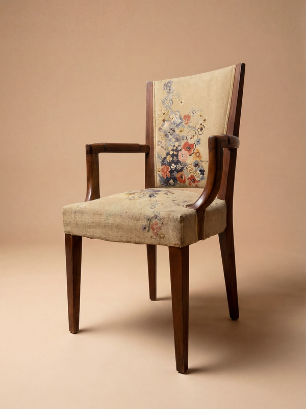 Ce fauteuil constitue un exemple raffiné de l’approche d’Eugène Printz en matière de sièges au début des années 1940, période durant laquelle il cherche à concilier la rigueur architecturale avec une sensibilité néoclassique renouvelée. Connu pour le dialogue étroit qu’il entretenait avec les artistes et les artisans, Printz concevait le mobilier non comme des objets isolés, mais comme des ensembles soigneusement équilibrés, où structure, surface et ornement se répondent. Le fauteuil est réalisé en noyer massif, avec une structure claire et lisible. Les pieds, droits et légèrement effilés, confèrent à l’ensemble une assise stable tout en conservant une certaine légèreté visuelle. Les accotoirs, subtilement galbés et assemblés avec précision, prolongent naturellement les montants, guidant le regard vers le dossier et renforçant la continuité de la silhouette. Les proportions sont mesurées et retenues, caractéristiques du travail de maturité de Printz, où le confort naît de la justesse géométrique plutôt que d’un rembourrage excessif. La tapisserie revêt ici une importance particulière. Le dossier et l’assise sont habillés de panneaux de tapisserie exécutés d’après un carton de Paul Gernez, l’un des artistes avec lesquels Printz collabore à cette époque. La composition florale se déploie verticalement sur le dossier, tandis que des motifs plus discrets animent l’assise, instaurant un rythme visuel sans jamais alourdir la structure. La tapisserie apporte couleur et texture, adoucissant les lignes architecturales du bois et inscrivant le fauteuil dans la grande tradition des arts décoratifs. Ce fauteuil incarne l’esprit du modernisme décoratif français, où le mobilier devient un point de rencontre entre beaux-arts, savoir-faire artisanal et exigence fonctionnelle. Il s’impose comme un objet cohérent et élégant, à la fois expressif et maîtrisé, pleinement représentatif de la contribution d’Eugène Printz au design français du XXᵉ siècle.