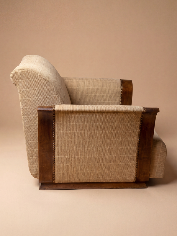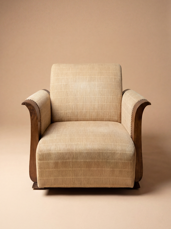 Ce fauteuil dessiné par Michel Dufet et réalisé vers 1930 par les Ateliers du Sylve – Le Bûcheron illustre une lecture raffinée de l’Art déco, où la rigueur des lignes dialogue avec une certaine douceur des volumes. La structure en bois massif, aux accoudoirs galbés et aux montants soigneusement profilés, affirme une présence à la fois élégante et architecturée. Le dessin privilégie la clarté constructive et l’équilibre entre assise généreuse et lignes contenues. Le fauteuil est présenté dans son état actuel ; une réfection complète de la tapisserie est à prévoir. Notre atelier peut naturellement prendre en charge ce travail, en proposant des tissus et finitions respectueux de l’esprit et de l’époque de la pièce.