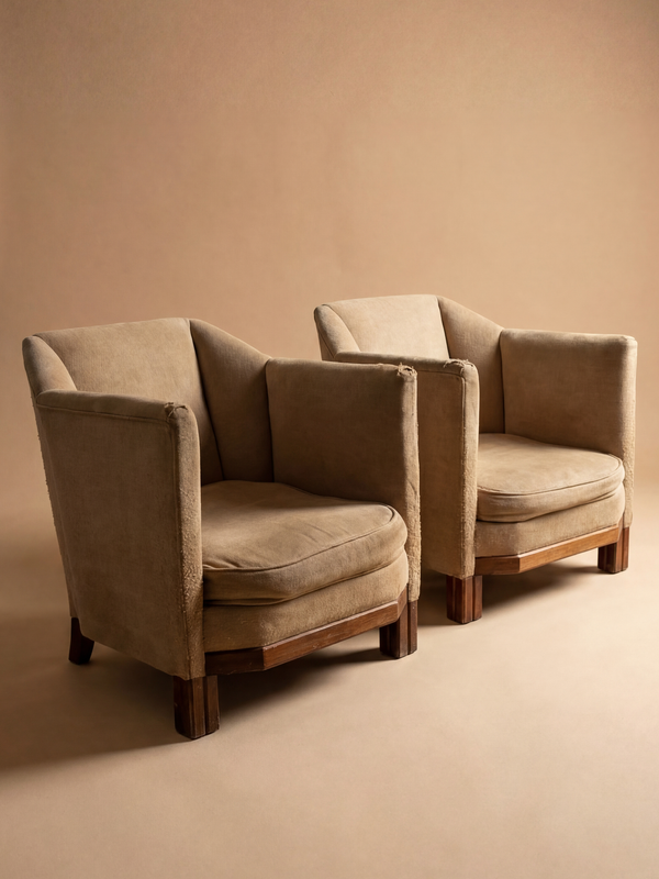 Une paire aux lignes sobres et équilibrées, caractéristique de l’esthétique Art Déco française. Les volumes sont pleins, avec des accoudoirs généreux et une assise profonde, offrant une silhouette à la fois douce et structurée. Le piètement en bois, discret mais bien dessiné, ancre l’ensemble avec élégance. Les proportions sont particulièrement réussies, avec un léger évasement du dossier qui apporte du mouvement à la forme. Ces fauteuils présentent un fort potentiel décoratif et de confort. Une retapisserie permettra de révéler pleinement leur caractère et d’en faire des pièces parfaitement adaptées à un intérieur contemporain ou plus classique. Les fauteuils sont présentés avec leur tissu d’origine. Une retapisserie est à prévoir ; celle-ci peut être entièrement prise en charge dans notre atelier, dans le respect des proportions et de l’esprit d’origine.