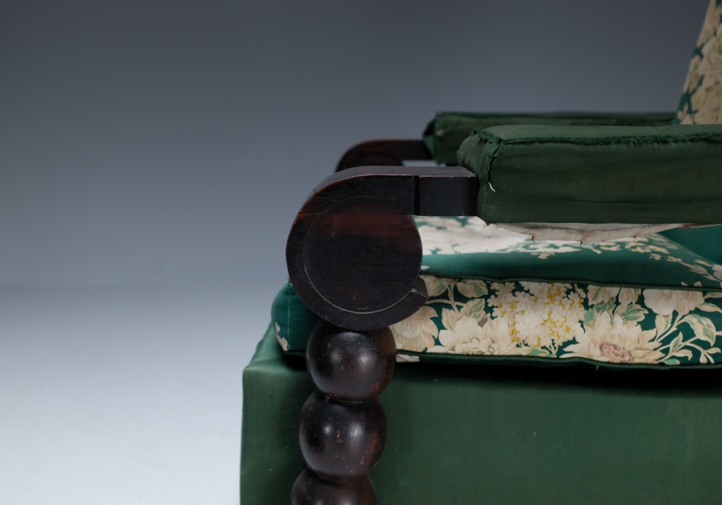 Cette paire de fauteuils art déco de fabrication régionale est issue d'un long et paisible siècle de vie dans une villa de Biarritz. Ils ont un rembourrage vert qui, sur son dossier et son assise, fait ressortir des figures florales blanches centrées. La personnalité du tissu est complétée par des signes d'utilisation intacts qui racontent des histoires de famille et le passage de différentes générations qui ont vu dans cette paire de fauteuils domestiques un membre de plus partageant son existence dans un lieu de repos détendu. Ces fauteuils sont très confortables et imposants. Tant l'origine des pièces que le travail sur la tapisserie pourraient laisser penser que cette œuvre pourrait être l'œuvre de Victor Courtray ou de Benjamin Gómez. Etant donné le caractère d'objet de collection, nous n'avons pas touché aux fauteuils, ils sont dans leur état d'origine dans lequel nous les avons trouvés. Cependant, nous pouvons nous charger de les retapisser avec le tissu au choix du futur propriétaire.