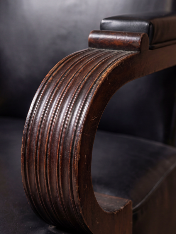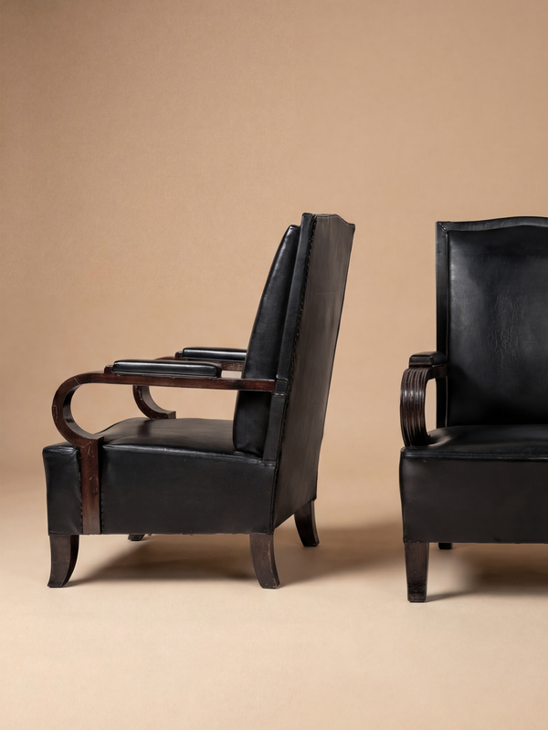 Cette paire de fauteuils constitue un exemple raffiné du travail d’André Arbus en France vers 1930, illustrant ses premières recherches autour d’un classicisme moderne fondé sur la proportion, la structure et la sobriété. Le dessin témoigne de la capacité d’Arbus à conjuguer rigueur architecturale et confort mesuré. Les fauteuils se distinguent par leurs dossiers hauts, légèrement inclinés, et par des assises généreuses aux proportions équilibrées. Les structures en bois sont animées par des accotoirs élégamment courbés, dont la ligne continue adoucit la géométrie et confère à l’ensemble une présence à la fois posée et sculpturale. L’ornementation, volontairement retenue, laisse s’exprimer la clarté constructive et l’harmonie des volumes. Les garnitures sont à reprendre. Notre atelier intégré peut assurer une réfection complète, avec une sélection de tissus d’exception et une finition sur mesure, choisies en dialogue avec le client. Bibliographie — Art et Décoration, mai 1938, p. 15.