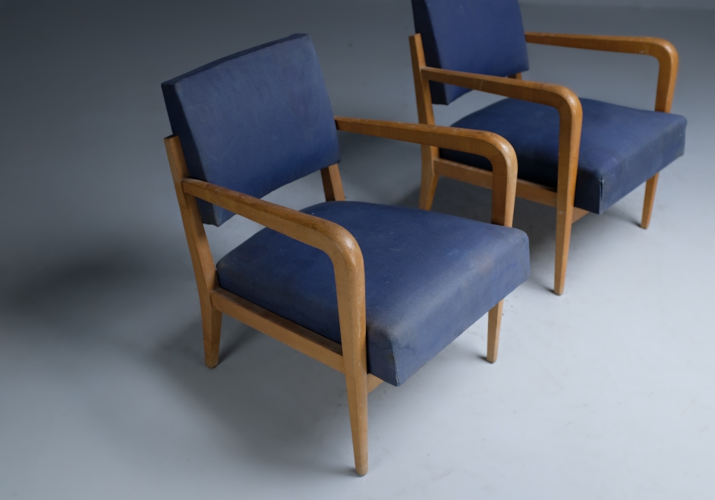 Ce magnifique ensemble de deux fauteuils dialoguent depuis leur création en 1941 par l'architecte français fondateur Henry Jaques Le Même pour le chalet Le Sarto à Megève. L'assise basse et longue révèleent des silhouettes de caractère reposant. Ils ont, tout au long de leur travail sur le bois de sycomore, des courbes qui brouillent les frontières entre le sinueux et le rectiligne. Cela se voit dans les accoudoirs aux surfaces arrondies et aux structures courbes qui se terminent par une inclinaison subtile. Aussi nous pouvons l'aprecier dans le délicat travail ergonomique du dossier. En raison de leur nature de collection, ces pièces n'ont pas subi de restauration. Nous pouvons bien entendu nous charger de les retapisser dans le tissu préféré de leur futur propriétaire.