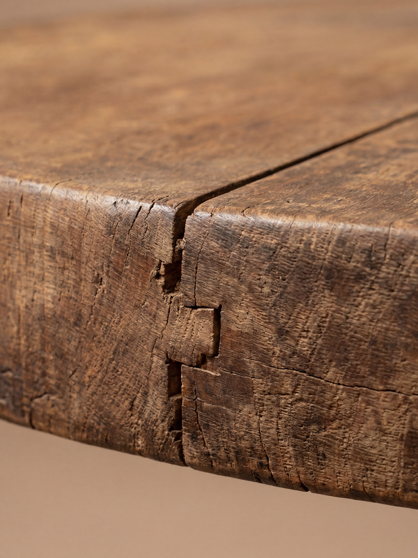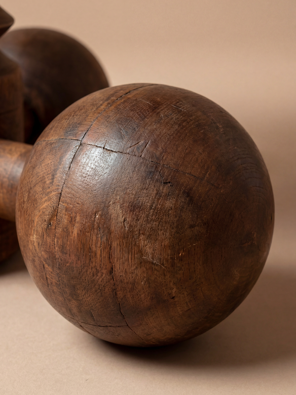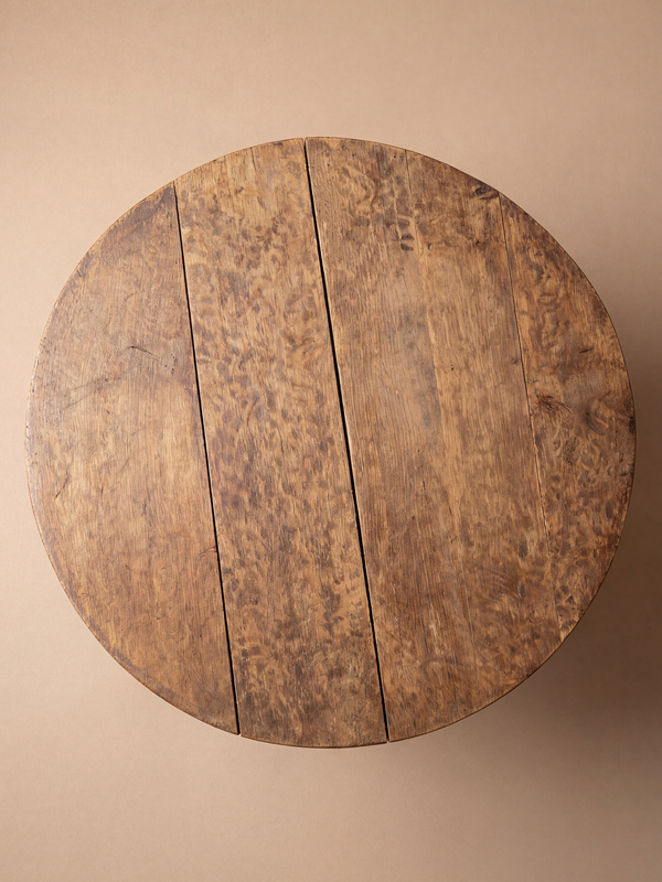 Ce guéridon en chêne, réalisé en France vers 1940, s’inscrit pleinement dans la veine régionaliste de l’Art déco français par sa matérialité franche et sa présence sculpturale. Le plateau circulaire épais, composé de larges planches assemblées, révèle joints visibles, usure et fentes naturelles, témoins du temps et d’un travail sans artifice. Le piétement central, puissamment tourné, repose sur une base tripode ponctuée de larges pieds sphériques. Cette architecture confère à l’ensemble une stabilité massive et une silhouette presque totémique, où la force des volumes prime sur l’ornement. Ce type de table est fréquemment attribué à Charles Dudouyt, figure majeure d’un Art déco rustique et humaniste, attaché aux formes vernaculaires, au travail du bois massif et à une esthétique volontairement expressive.