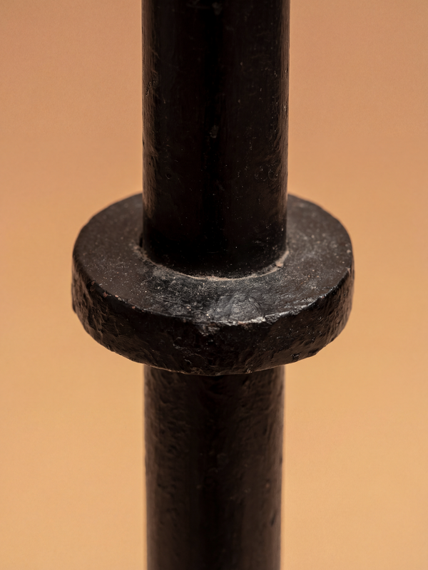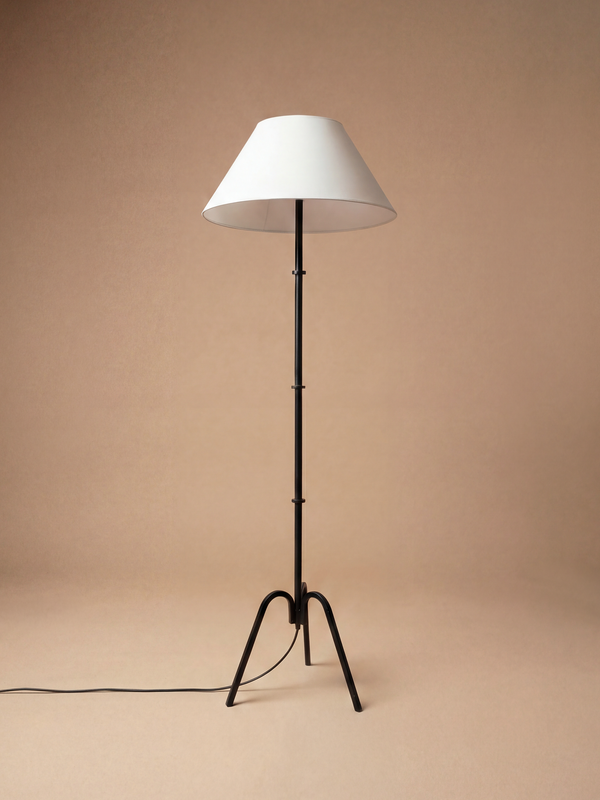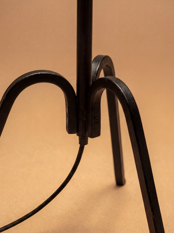 Ce lampadaire en fer forgé, attribué à Jacques Adnet, illustre avec sobriété l’élégance du mobilier français autour de 1940. La tige élancée, rythmée par de discrets anneaux, affirme une ligne architecturale nette, caractéristique du classicisme modernisé cher à Adnet. La base tripode, composée de trois pieds en fer délicatement cintrés, introduit un jeu de courbes mesuré tout en assurant une parfaite stabilité. La surface forgée à la main présente une patine profonde et nuancée, marquée de légères traces d’usage qui soulignent la qualité du travail artisanal. Surmonté d’un abat-jour en tissu légèrement évasé, le lampadaire diffuse une lumière douce et maîtrisée. Ce modèle a été à plusieurs reprises attribué à Jacques Adnet dans le cadre de ventes organisées par de prestigieuses maisons de ventes internationales, confirmant sa place au sein de la production française de luminaires en fer forgé de haute qualité.