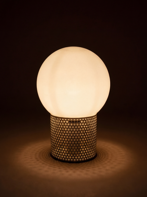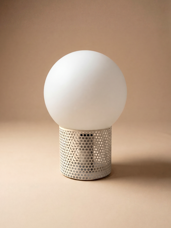 Cette pièce incarne une vision rigoureuse et élégante du design français, où la simplicité géométrique devient un véritable langage formel. La sphère en verre opalin diffuse une lumière douce et homogène, créant une ambiance chaleureuse et enveloppante. Elle repose sur une base cylindrique en métal laqué blanc perforé, dont le motif régulier génère un subtil jeu d’ombres et de lumière. À la fois minimaliste et expressive, cette lampe allie pureté des formes et richesse des effets lumineux. Une pièce emblématique, idéale pour structurer un espace avec discrétion et caractère. Une paire disponible.