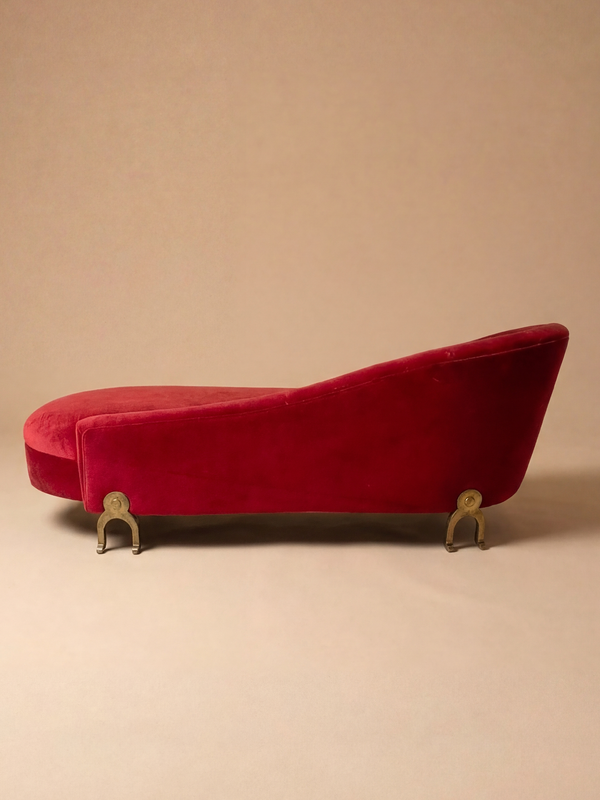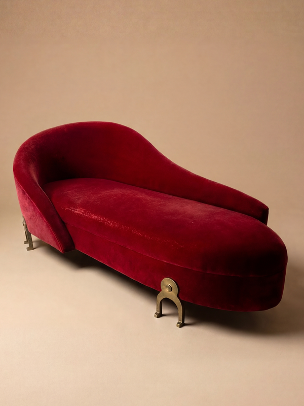 Cette méridienne déploie une silhouette libre et presque organique, caractérisée par une ligne fuyante qui s’élève en douceur vers le dossier. L’asymétrie assumée et la tension entre les volumes pleins et les courbes tendues évoquent un vocabulaire formel typique des années 1980, où la fonction s’efface au profit d’une écriture plus expressive. Le velours rouge, profondément saturé, capte la lumière avec intensité et révèle une patine subtile, presque vibrante. Les zones légèrement éclaircies, les reflets changeants du textile, participent à une présence sensuelle et vivante, loin de toute uniformité. Le piétement en métal, aux formes volontairement primitives et sculpturales, introduit un contraste fort avec la douceur de l’assise. Ce dialogue entre matière brute et surface précieuse s’inscrit dans l’esprit de Garouste & Bonetti, dont le travail mêle artisanat, références archaïques et liberté formelle, dans une approche à la fois baroque, poétique et volontairement non conventionnelle. La méridienne est présentée dans son tissu actuel. Une retapisserie peut être envisagée ; celle-ci peut être entièrement prise en charge dans notre atelier, dans le respect des proportions et de l’esprit d’origine.