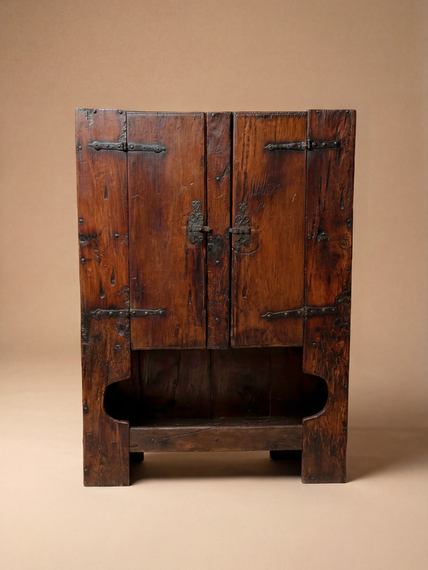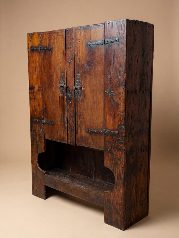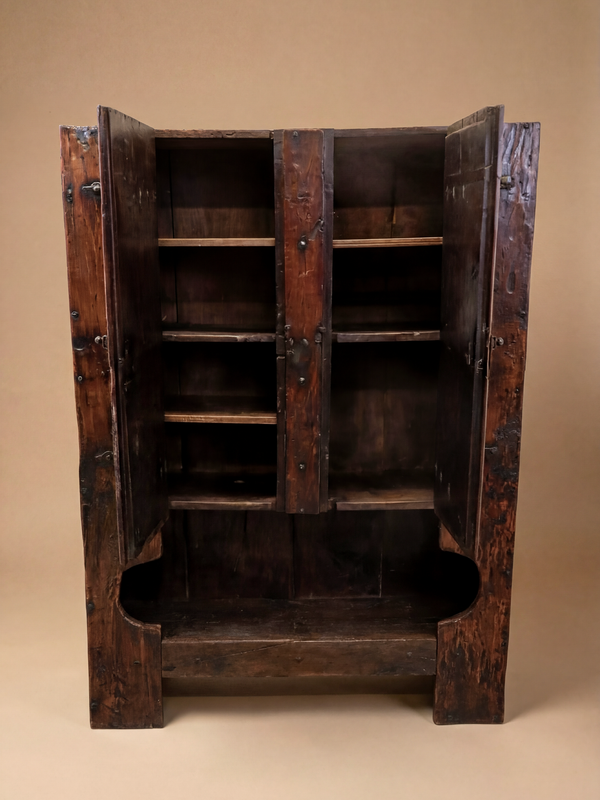 Ce cabinet d’art populaire des Alpes françaises, daté du XIXe siècle, est un bel exemple de mobilier vernaculaire de montagne. Réalisé en bois massif, il présente une structure compacte et architecturée, marquée par des montants épais et une niche basse ouverte, probablement destinée au rangement d’objets du quotidien. Les deux portes à panneaux sont montées sur des pentures en fer forgé d’origine, accompagnées de loquets façonnés à la main, dont la patine sombre contraste avec la teinte chaude et usée du bois. L’intérieur, organisé par de simples étagères fixes, répond à une logique strictement fonctionnelle. Les traces d’usage, marques d’outils et réparations anciennes témoignent d’une longue vie domestique.