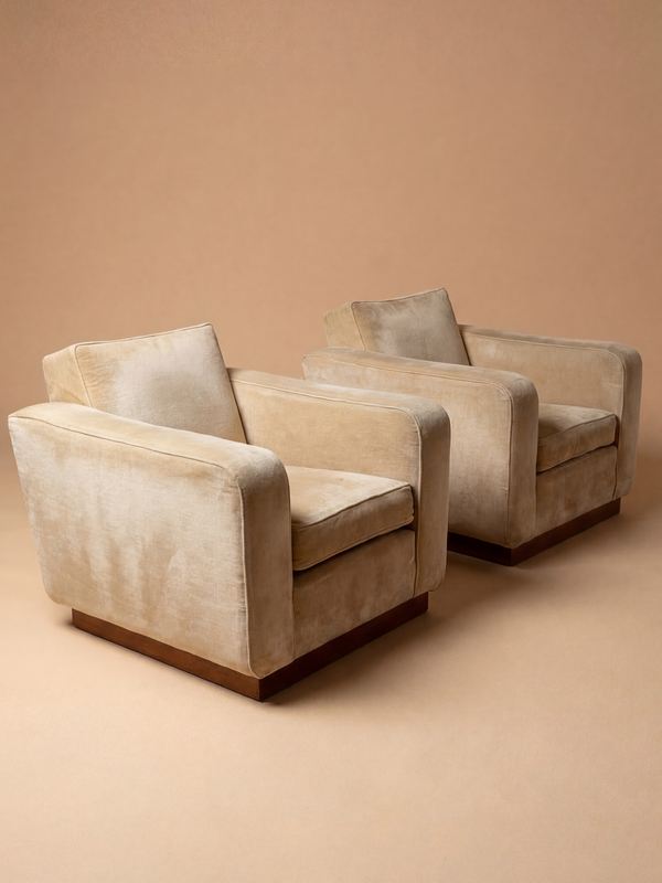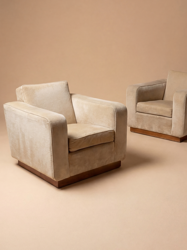 Cette paire de fauteuils lounge développe une présence calme et structurée, portée par des volumes pleins et une silhouette basse, presque architecturée. Leur dessin, caractéristique du mobilier français des années 1940, évoque l’élégance rigoureuse de Jacques Adnet. Les accoudoirs larges prolongent naturellement l’assise, dessinant un ensemble continu et enveloppant. Le tissu beige, sobre et lumineux, met en valeur la douceur des formes, tandis que la base en bois vient discrètement ancrer la composition. Entre confort et rigueur formelle, ces fauteuils traduisent une approche française où la proportion prime sur l’ornement. Ils trouvent facilement leur place dans des intérieurs construits, apportant stabilité, cohérence et présence. Les fauteuils sont présentés avec leur tissu d’origine. Une retapisserie est à prévoir ; celle-ci peut être entièrement prise en charge dans notre atelier, dans le respect des proportions et de l’esprit d’origine
