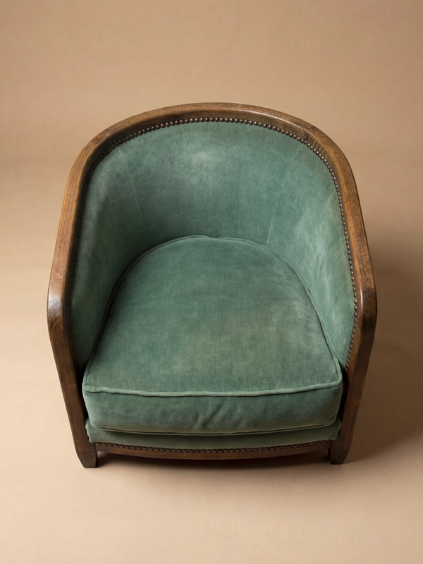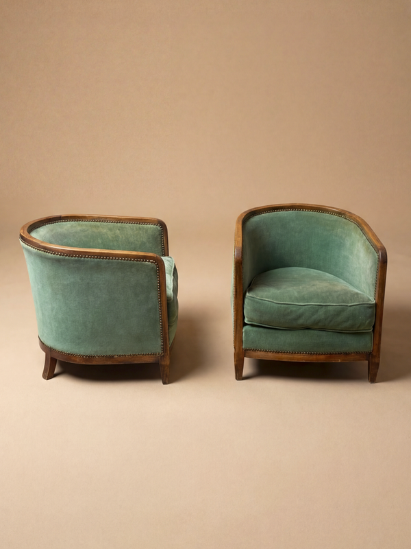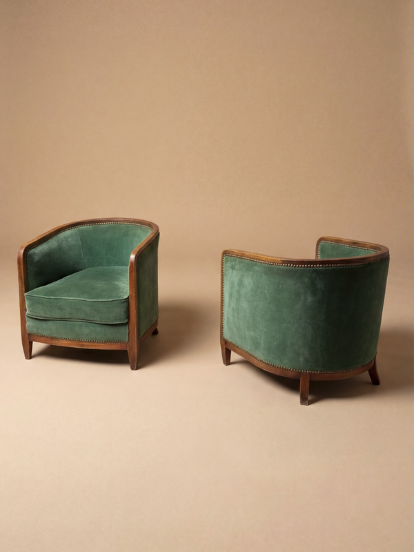 Cette paire de fauteuils Art Déco, France, vers 1930, s’inscrit dans une esthétique sobre et architecturale, proche de l’œuvre de Jean-Michel Frank, à laquelle elle peut être rapprochée. Les lignes sont continues et enveloppantes, dessinant des volumes équilibrés et parfaitement maîtrisés. La structure en bois massif affirme une présence discrète mais assurée, avec des proportions basses et généreuses caractéristiques des fauteuils de salon de cette période. L’ensemble privilégie la pureté du dessin et la qualité des matériaux, sans recours à l’ornement. Les fauteuils sont présentés avec leur tissu d’origine. Une retapisserie est à prévoir ; celle-ci peut être entièrement prise en charge dans notre atelier, dans le respect des proportions et de l’esprit d’origine.