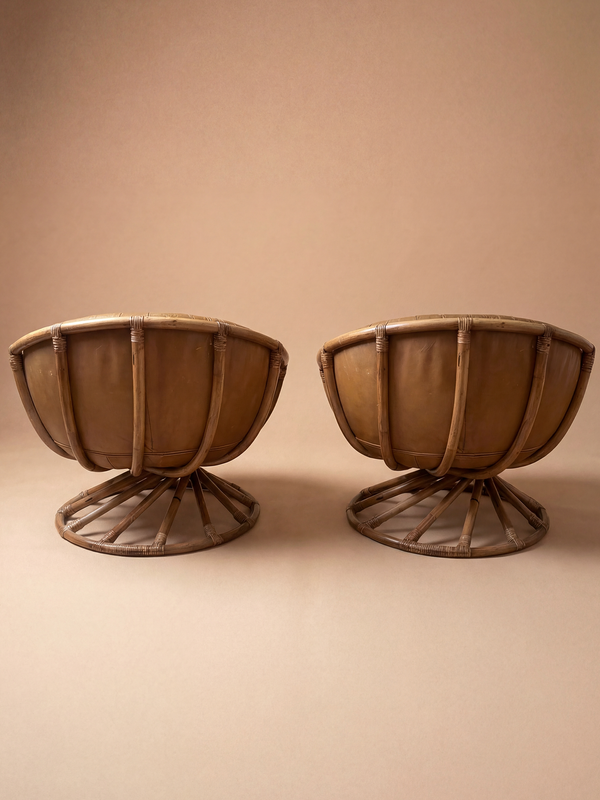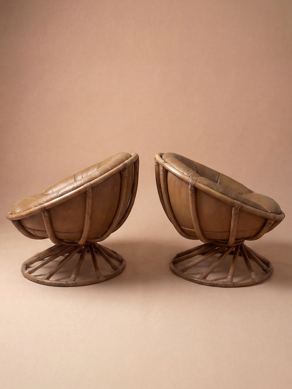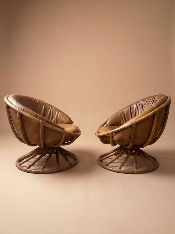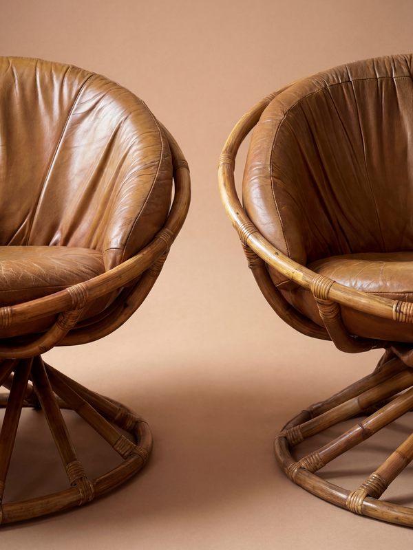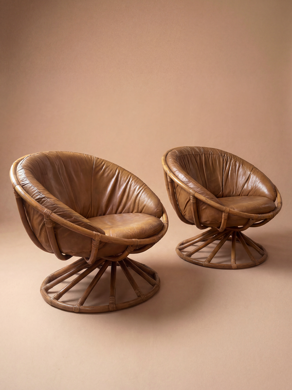Ces fauteuils sculpturaux de Bernard Govin illustrent avec justesse l’esprit libre et expérimental du design français de la seconde moitié du XXᵉ siècle. Leurs formes généreuses et enveloppantes, posées très bas, instaurent une relation immédiate au corps et à l’espace, entre confort et présence plastique. La structure en rotin cintré dessine une architecture lisible, rythmée par des montants verticaux et une base circulaire évoquant un mouvement de rotation. Le cuir, subtilement patiné, épouse la courbe de l’assise et du dossier, soulignant la continuité des volumes. Observés sous tous les angles, ces fauteuils révèlent un équilibre maîtrisé entre artisanat et recherche formelle, caractéristique du travail de Govin, où l’usage, la sensualité des matériaux et la force sculpturale dialoguent avec une élégance discrète.
