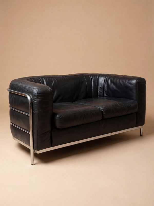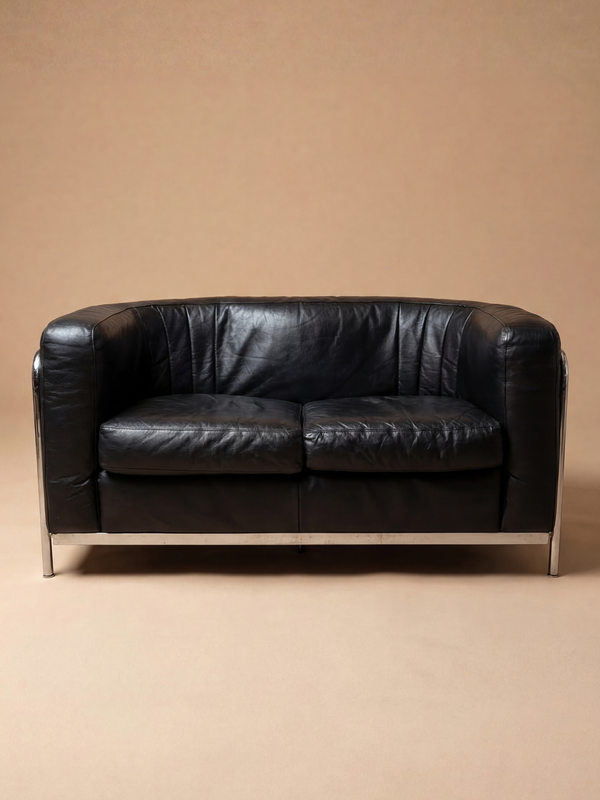 Ce canapé Onda de De Pas, D’Urbino et Lomazzi, édité par Zanotta, se distingue par une présence architecturale affirmée, où la courbe enveloppante du dossier et des accoudoirs forme un volume continu et protecteur. La silhouette se déploie dans un geste fluide, à la fois structuré et accueillant. Revêtu d’un cuir noir, il présente une patine riche marquée par des plis naturels, qui renforcent la profondeur et le caractère de la matière. La structure en métal poli vient souligner le contour avec précision, instaurant une tension subtile entre la rigueur linéaire du cadre et la douceur des volumes rembourrés. À la croisée du confort et de la rigueur formelle, cette pièce se situe entre sculpture et fonction. Son dessin, à la fois puissant et maîtrisé, incarne une vision exigeante du mobilier moderne, où ligne, matière et proportion dialoguent avec justesse.