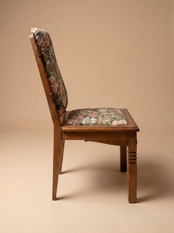 Bel ensemble aux lignes franches, caractéristique du travail de Dudouyt, où la simplicité des volumes dialogue avec une présence architecturale affirmée. Le dessin est structuré, presque rigoureux, tout en conservant une certaine chaleur. Le chêne massif révèle une belle patine, soulignant les jeux de sections et les détails sculptés des pieds et des traverses. Les dossiers garnis apportent un contraste décoratif, adoucissant l’ensemble. Typiques de l’esthétique régionaliste française des années 1940, ces chaises offrent une assise confortable et une silhouette immédiatement reconnaissable, idéale pour structurer une salle à manger avec caractère. Elles sont signées. Les chaises sont présentées avec leur tissu d’origine. Une retapisserie est à prévoir ; celle-ci peut être entièrement prise en charge dans notre atelier, dans le respect des proportions et de l’esprit d’origine.