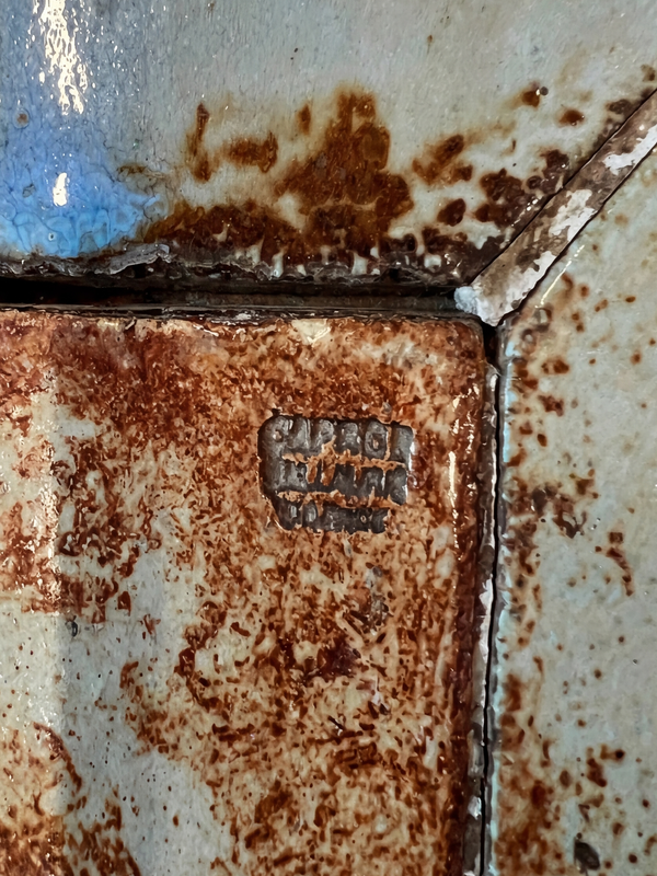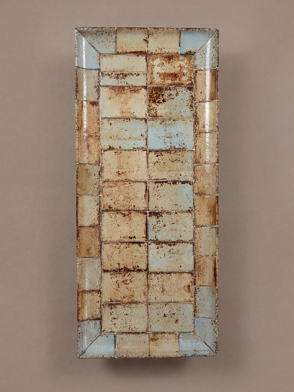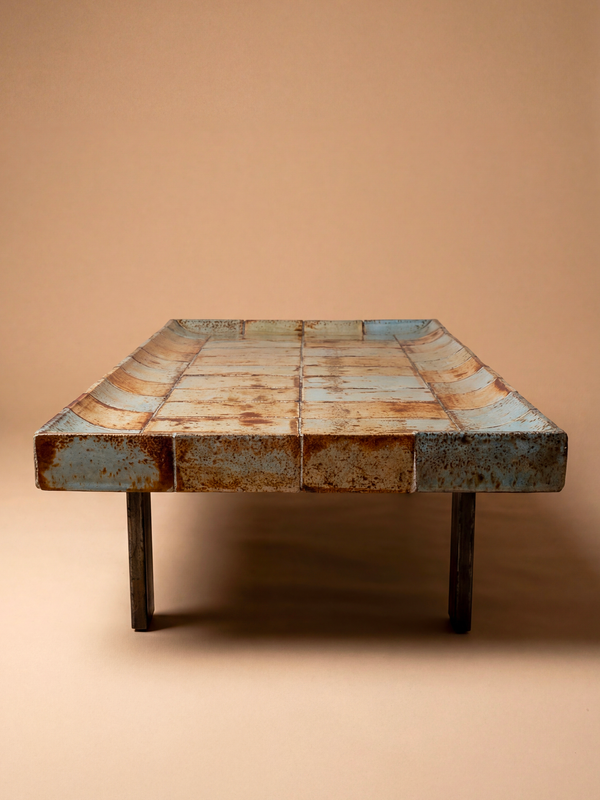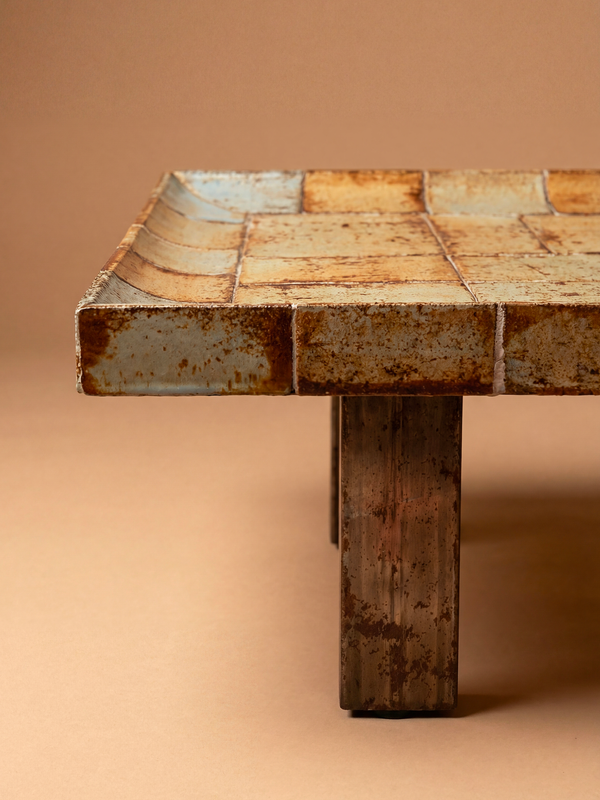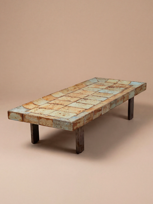 Cette table basse Cuvette de Roger Capron s’inscrit pleinement dans l’œuvre du grand céramiste français et dans l’histoire de Vallauris, haut lieu du renouveau de la céramique d’après-guerre. Conçue comme un véritable objet d’art, elle témoigne de la volonté de Capron d’intégrer la céramique au mobilier, en lui donnant une dimension architecturale et sculpturale. Le plateau est composé d’un assemblage de carreaux de grès émaillé, disposés en une composition rigoureuse et pourtant vibrante. La surface présente une légère concavité — la « cuvette » — soulignée par un bandeau périphérique aux angles soigneusement traités. Les émaux, aux tonalités minérales allant du crème au brun doré, ponctués de nuances bleu pâle, révèlent un travail de cuisson maîtrisé, laissant apparaître des effets de matière, de profondeur et de variation chromatique caractéristiques de la production de Vallauris. Vu de profil, le plateau semble flotter au-dessus de piètements rectilignes en métal patiné, dont la sobriété contraste élégamment avec la richesse tactile de la céramique. Ce dialogue entre artisanat et modernité est au cœur du langage de Roger Capron, qui parvient ici à concilier usage quotidien et présence plastique. À la fois table basse fonctionnelle et composition sculpturale, ce modèle Cuvette incarne une vision humaniste du modernisme français, où la main de l’artisan demeure visible et essentielle. Une pièce emblématique, pensée pour habiter l’espace avec calme, équilibre et une autorité silencieuse.