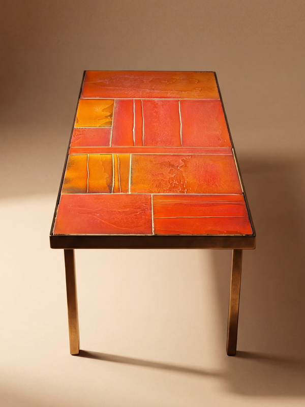 Une composition vibrante où la céramique s’exprime en larges aplats aux nuances rouges et orangées. Le décor, rythmé par des lignes graphiques, évoque un paysage abstrait aux effets de matière profonds. La surface en lave émaillée révèle de subtiles variations et une texture riche, typiques du travail de Capron à Vallauris. Chaque carreau capte la lumière différemment, renforçant la dimension picturale de l’ensemble. Reposant sur un piétement métallique fin, la table offre un contraste élégant entre chaleur minérale et structure épurée, idéale pour un intérieur moderniste ou méditerranéen. Léger défaut de surface visible sur la dernière photo, sans incidence structurelle.
