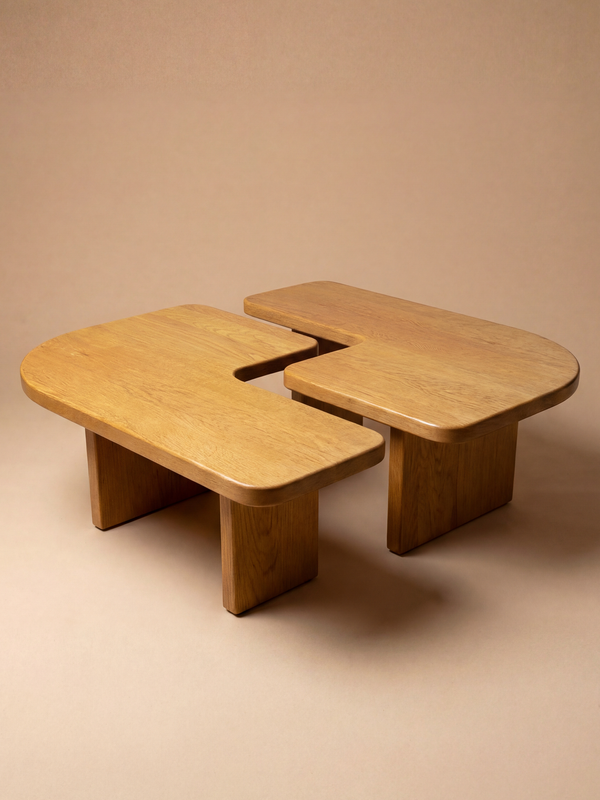 Cette table modulable en chêne massif, réalisée par Ébénisterie Seltz, se distingue par une approche à la fois rationnelle et sculpturale du mobilier domestique. Composée de deux éléments indépendants, elle permet différentes configurations, du format compact à une composition plus ample, selon l’espace et l’usage. Les plateaux aux angles adoucis dialoguent avec des piètements pleins, affirmant une construction lisible et rigoureuse. Le travail du chêne met en valeur un grain dense et régulier, tandis que les assemblages précis témoignent d’un haut niveau d’exécution artisanale. Pensée comme un meuble évolutif, cette table illustre parfaitement l’esprit fonctionnel et sobre de la production Seltz, où la modularité ne sacrifie jamais la qualité formelle ni la présence matérielle.