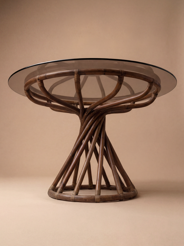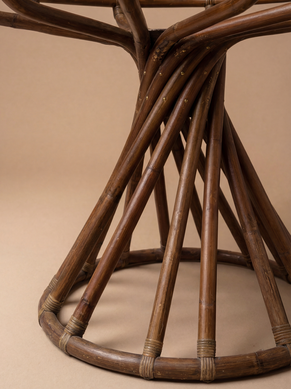 Cette Table Manille Écorsé, dessinée par Bernard Govin et éditée par Eguizier, propose une lecture sculpturale du design français de la fin des années 1960, où la structure et le matériau deviennent les véritables éléments d’expression. Le plateau circulaire en verre apporte une légèreté visuelle, laissant pleinement apparaître le travail du piétement. Le fût central est composé d’éléments en rotin entrelacés selon une composition radiale dynamique. Cette construction « écorsée » révèle la logique de l’assemblage et transforme les supports fonctionnels en une forme rythmée, presque architecturale. La base circulaire fait écho au plateau, renforçant l’équilibre et la cohérence de l’ensemble. À la fois graphique et organique, cette table se situe à la frontière du design et de l’artisanat. Elle témoigne de l’intérêt de Govin pour les structures expérimentales et les matériaux naturels, donnant naissance à une pièce élégante, tactile et emblématique de son époque.