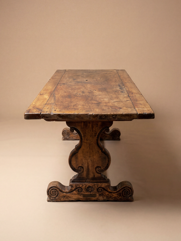 Table de ferme au caractère affirmé, révélant toute la chaleur et la profondeur du noyer ancien. Le plateau généreux, marqué par le temps, présente une patine riche, ponctuée de traces d’usage et de veinages expressifs. Le piètement à tréteaux, sculpté et élégamment galbé, apporte à la fois stabilité et présence décorative. Les proportions sont justes, mêlant robustesse rustique et finesse d’exécution. Idéale en table de repas ou en console, elle incarne pleinement l’esprit du Sud de la France. Sa surface vécue et sincère lui confère une présence intemporelle et accueillante.