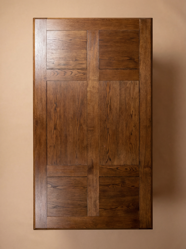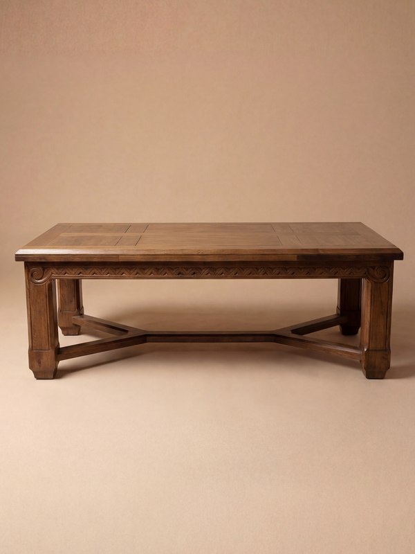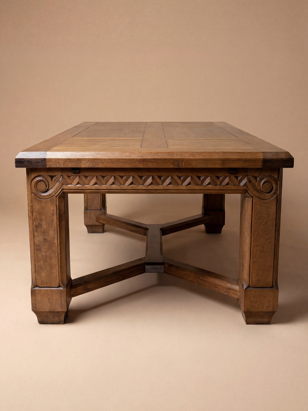 Cette table de salle à manger en chêne est une œuvre emblématique du mouvement Seiz Breur, attribuée à André Le Picard. Elle se distingue par une architecture rigoureuse et une sobriété décorative typique de l’esthétique bretonne modernisée des années 1930, où la tradition artisanale dialogue avec une construction rationnelle. Le plateau rectangulaire présente un élégant jeu de panneaux en chêne massif, encadré par une ceinture finement sculptée de motifs géométriques continus. Les pieds massifs, reliés par une entretoise travaillée, assurent une grande stabilité tout en affirmant une présence sculpturale forte et équilibrée. Dotée de deux rallonges de 50 cm chacune, cette table peut passer de 200 cm à 300 cm de longueur, offrant une remarquable modularité sans compromettre la cohérence du dessin. Une pièce rare, à la fois fonctionnelle et architecturale, représentative du meilleur du mobilier Seiz Breur.