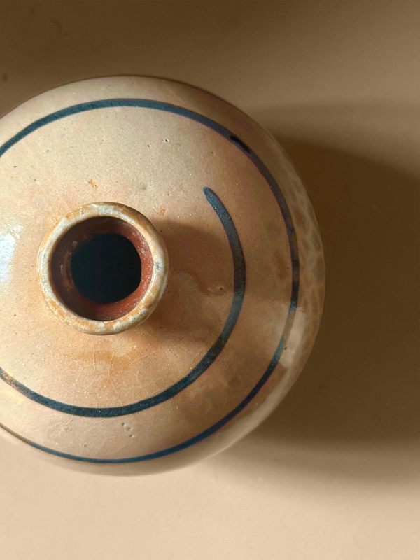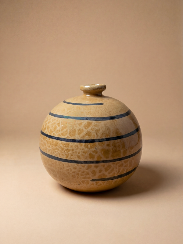 Ce vase en céramique constitue un bel exemple du travail de Francis Jourdain en France vers 1920, période durant laquelle il développe un modernisme sobre, fonctionnel et profondément attaché à la justesse des formes. La silhouette sphérique, équilibrée et sans emphase, traduit son refus de tout décor superflu au profit de la proportion. La pièce présente un corps généreux surmonté d’un col court et légèrement évasé. La surface est rythmée par des bandes horizontales bleu cobalt, discrètement intégrées à une glaçure aux tons chauds, ocre et beige, dont le réseau de craquelures révèle la richesse de la cuisson. Le revers porte une inscription manuscrite attestant de son caractère artisanal. À la fois objet d’usage et forme sculpturale, cette céramique incarne l’esprit humaniste et rigoureux du modernisme français de l’entre-deux-guerres.