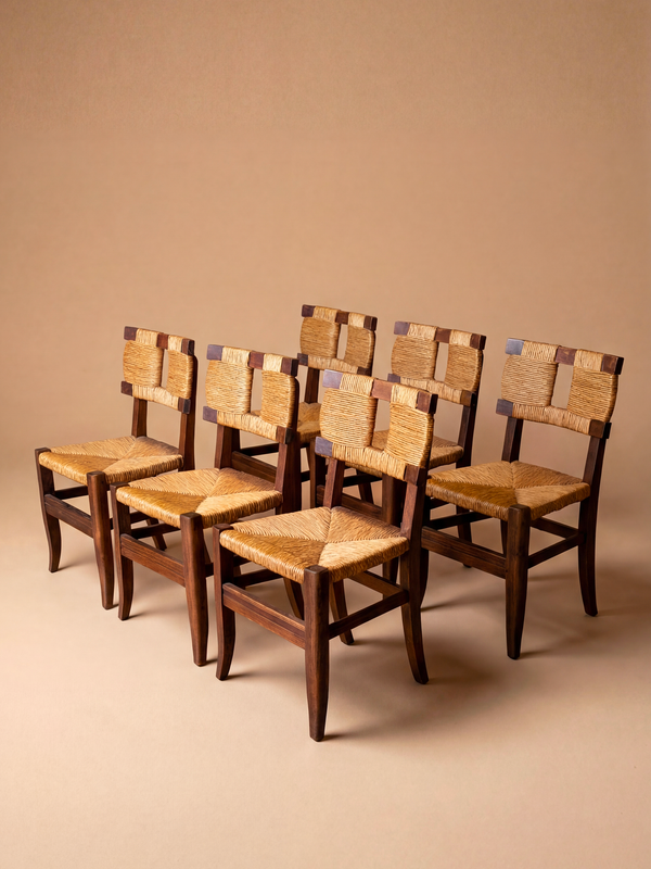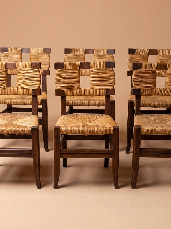 This set of six oak and rush chairs, dating from the 1940s, belongs to the tradition of French regionalist Art Deco, as seen in the work of figures such as Victor Courtray or Joseph Savina. During this period, furniture design sought to reconcile formal rigor with a deep connection to local craftsmanship, favoring simple, durable materials executed with great precision in both design and construction. Conceived for everyday use, these chairs express a measured modernity, shaped by the decorative legacy of the 1930s and by a more essential approach born of postwar constraints. The solid oak frames display balanced proportions and gently tapered legs, reflecting a sober vocabulary in which line takes precedence over ornament. The oak, deliberately left expressive, has developed a warm, deep patina that highlights the grain and natural variations of the wood. The construction is direct and fully legible, reinforced by low stretchers that emphasize the functional and robust character of the ensemble. The seats and backrests are woven in natural rush with great regularity and care. The seats feature a tight, radiating pattern with a discreet yet controlled geometry. The backrests are distinguished by an open rectangular motif, framed with carefully wrapped rush, recalling certain graphic explorations of late Art Deco applied to rural or regional furniture. The contrast between the dark oak structure and the lighter woven surfaces creates a subtle dialogue of materials and textures. Together, the six chairs form a coherent and harmonious set, emblematic of a French Art Deco tradition equally attached to artisanal heritage and modernity. Furniture conceived to endure, to serve, and to acquire a dignified patina over time.