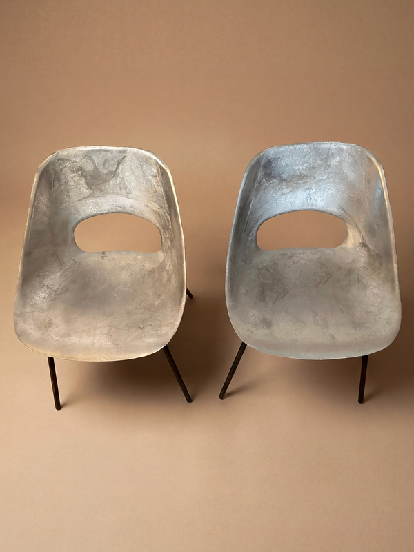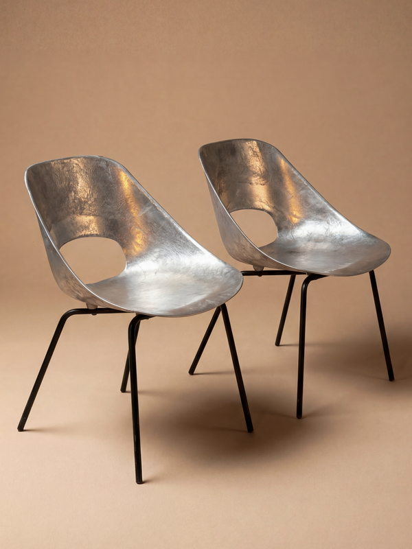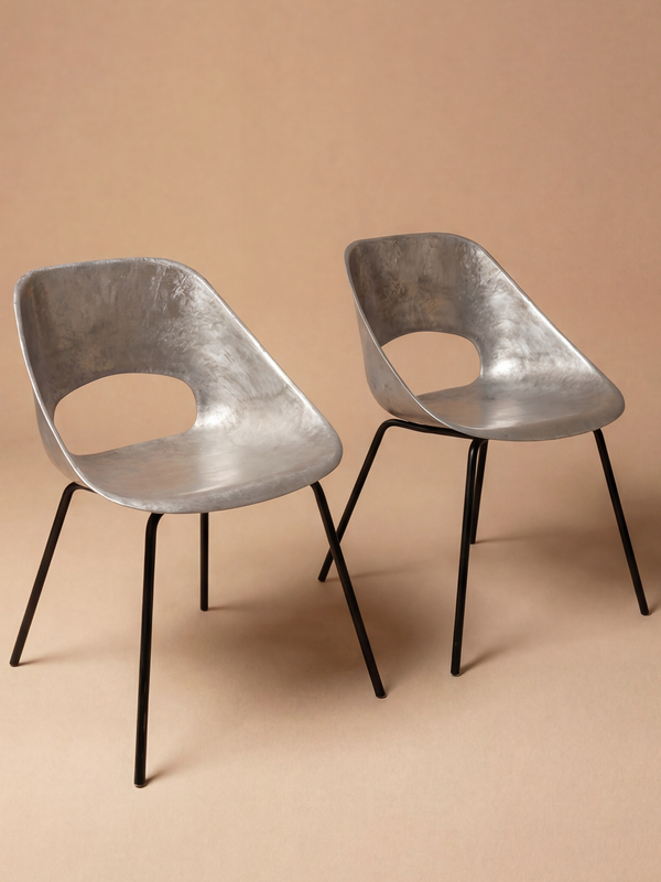 This aluminium chairs is a clear expression of Pierre Guariche’s early design language, developed at a moment when French designers were rethinking furniture through the lens of industry, lightness, and modern living. Conceived around 1950 and produced by Steiner, these chairs belong to Guariche’s first experiments with metal seating, anticipating the rational and elegant vocabulary that would later define his mature work. The seats are formed from casted aluminium, sculpted into a continuous, enveloping shell. Their fluid, asymmetrical profile creates a subtle balance between comfort and visual tension, while the oval opening in the backrest introduces both lightness and a functional grip, reinforcing the chair’s practical intent. The surface retains a softly textured, almost mineral patina, revealing traces of fabrication and use that underscore the honesty of the material. The shells rest on slender black lacquered metal legs, slightly splayed, giving the chairs a poised and stable stance. This contrast between the silvery aluminium and the dark steel structure highlights Guariche’s interest in clear structural legibility and restrained material dialogue. These chairs stand as an important testament to the experimental spirit of French design in the early 1950s, when furniture became a field for innovation rather than ornament. Both sculptural and utilitarian, they embody a modern ideal where form follows use with intelligence and restraint. Price is per chair.