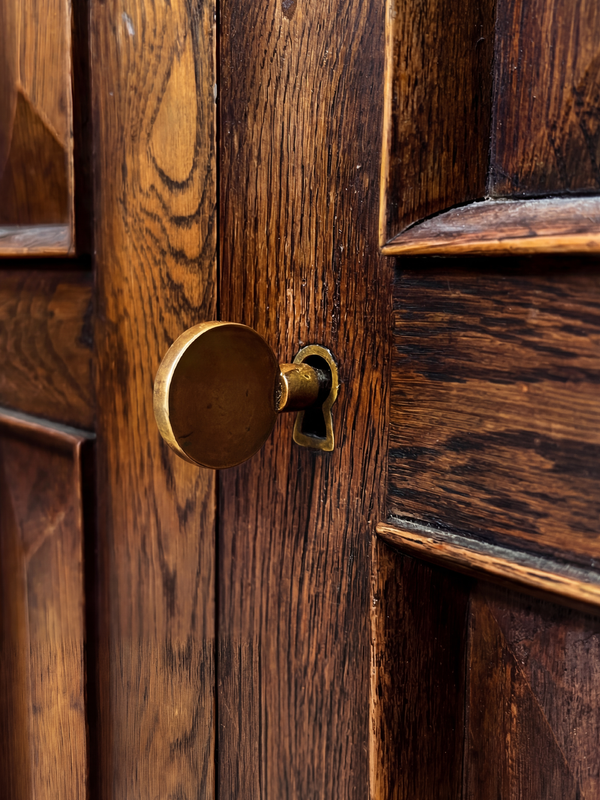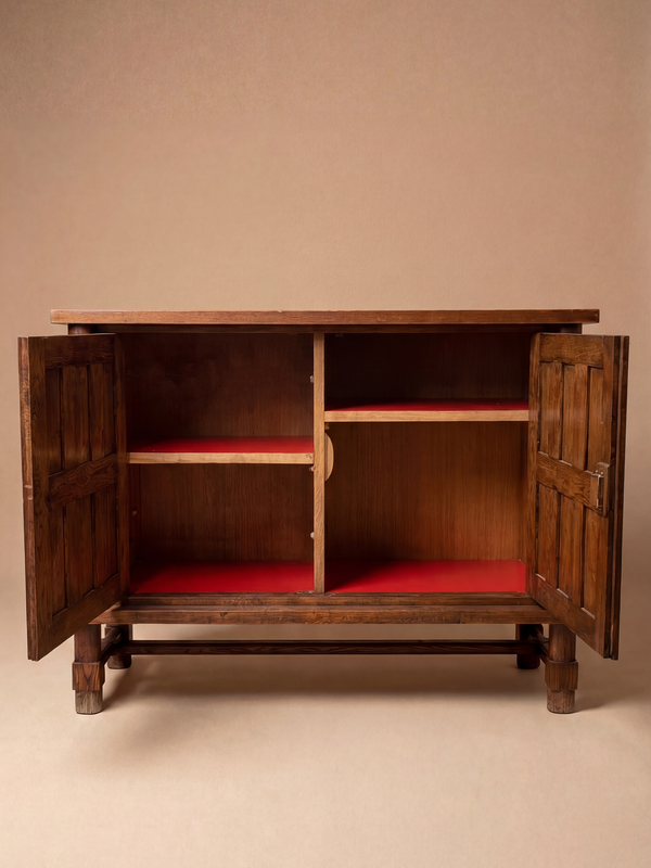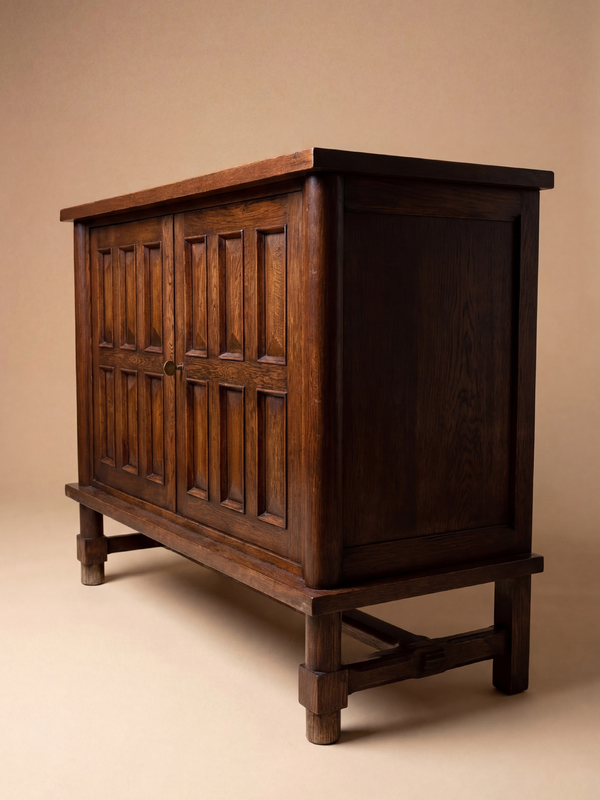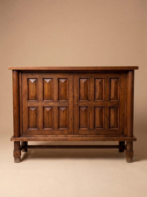 This oak chest of drawers by Jacques Adnet reflects a refined balance between architectural rigor and restrained decoration. The front is structured by a sequence of subtly sculpted panels, whose regular geometry creates a calm and ordered rhythm. The rounded uprights frame the piece with softness, subtly contrasting with the crisp lines of the top and apron. The cabinet stands on an open base with a stretcher, visually lightening the composition while reinforcing its constructed character. The oak, with its deep and warm tones, highlights the quality of craftsmanship and the precision of the joinery. The whole conveys a controlled elegance, characteristic of Adnet’s language, where every detail contributes to a coherent whole. Model documented in Mobilier et Décoration, issue no. 1, February 1946.