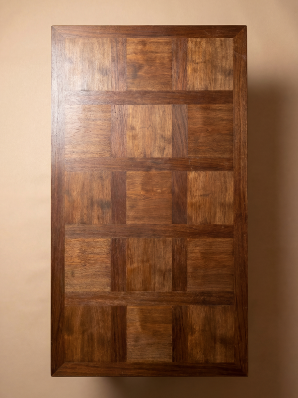 A characterful piece where the material is fully expressed through a rich and structured use of oak. The top features an elegant panelled composition, revealing warm tones and a lively grain. With its extensions, the table can reach a total length of 3 meters, offering generous seating capacity. The architectural base, composed of six turned legs connected by a cross stretcher, provides remarkable stability while asserting a strong sculptural presence. The rustic inspiration is handled with balance and restraint. The overall aesthetic is both robust and refined. The proportions are generous, and the carefully executed details reflect a high level of craftsmanship, in the spirit of French furniture from the 1940s.