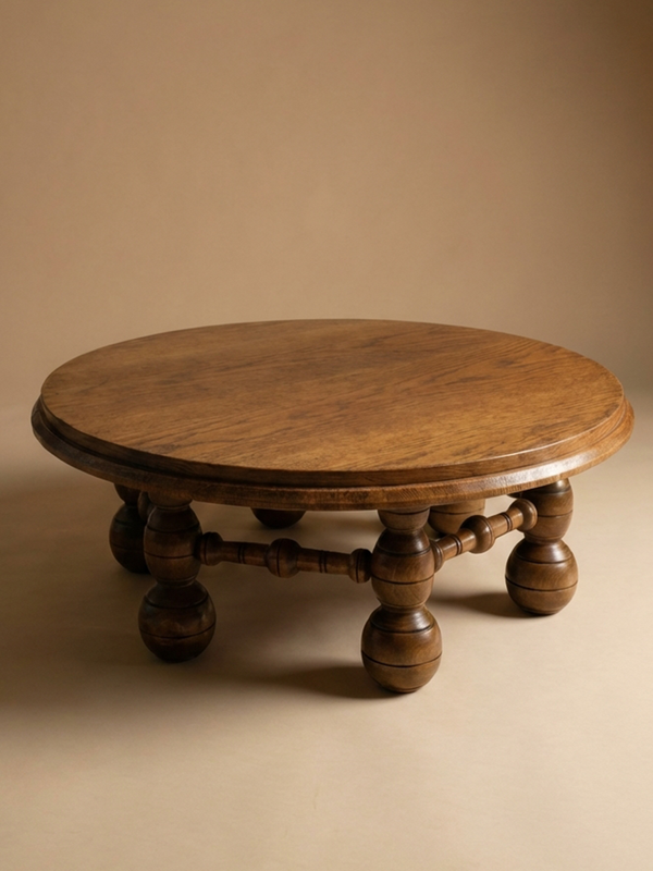 This coffee table is a strong and eloquent example of French Art Deco regionalist production from the 1940s, a period in which designers and craftsmen sought to reconcile modern form with a renewed attachment to traditional materials and vernacular construction. Entirely crafted in solid oak, it presents a low, generous silhouette anchored firmly to the ground, conveying both stability and presence. The round tabletop, thick and slightly overhanging, reveals a beautifully aged surface. Its patina is warm and nuanced, with visible grain, subtle variations in tone, and traces of use that speak to decades of life rather than wear. The edge is softly profiled, reinforcing the sense of mass while maintaining a restrained elegance. Beneath, the structure is particularly expressive. Six turned legs are rhythmically arranged around the perimeter, each composed of rounded, almost sculptural volumes. These bulbous forms, characteristic of the period, introduce a strong geometric vocabulary that is both decorative and structural. The legs are connected by delicately turned cross-stretchers, whose refined profiles contrast with the robustness of the feet and ensure visual continuity as well as solidity. This balance between weight and finesse, ornament and function, is emblematic of the regionalist spirit within Art Deco. While rarely documented in period catalogues, tables of this type are often associated with the circle of Charles Dudouyt. The expressive turning, the honest use of oak, and the architectural clarity of the construction closely align with his approach, which played a key role in shaping a distinctly French path toward modern design. At once sculptural and functional, this coffee table stands as a compelling testament to postwar craftsmanship, where material integrity and form are allowed to speak with quiet authority.
