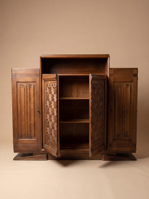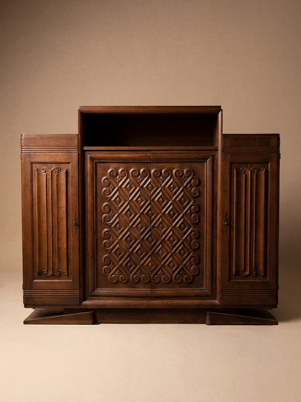 This oak sideboard is a strong expression of the Seiz Breur movement, which sought to renew Breton decorative arts through a dialogue between modern form and regional tradition. Its composition is both powerful and balanced, structured around a central block flanked by two lateral cabinets, giving the piece a distinctly architectural presence. The sculpted central panel forms the focal point, featuring deeply carved geometric motifs animated by controlled curves. This decorative language directly echoes the Seiz Breur aesthetic: a modern abstraction rooted in stylised Celtic references. The more restrained side panels provide visual contrast, enhancing the clarity and rhythm of the overall design. Craftsmanship is of a high standard, with thick oak panels, precise joinery, and a solid architectural base. Measuring 200 cm in width and 170 cm in height, this sideboard combines monumentality, functionality, and cultural identity, making it a compelling example of modernist Breton furniture.