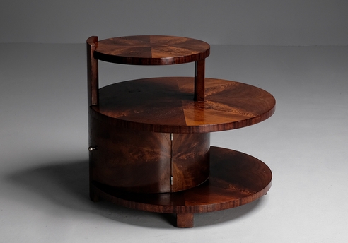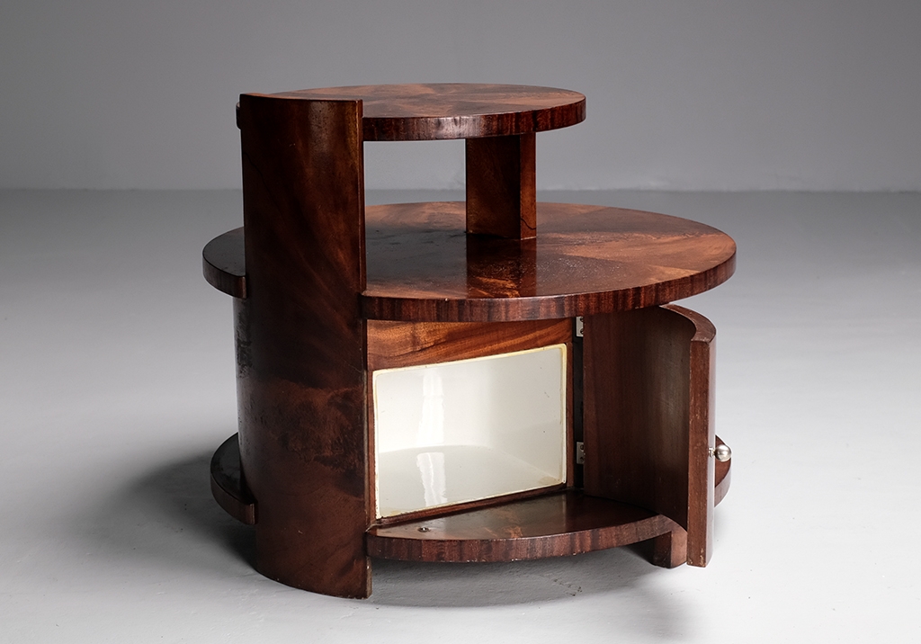 Typical of Modernist style, the simple and delicate shapes of this side table adorn the space with a touch of elegance. It combines aesthetics with utility. This side table is composed of three mahogany veneer tops and embellished with a door at its lower level.