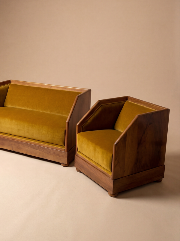 This Art Deco living room set, created in France around 1920, stands out for its rigorous yet elegant composition. The strong geometric volumes, faceted armrests, and architectural silhouette clearly reflect the structured aesthetic of the period. The solid wooden frames reveal a warm, expressive grain, enhanced by well-balanced proportions and subtly rounded feet. The seating is generous yet disciplined, emphasizing clarity of form and a careful balance between mass and comfort. The ensemble has been fully reupholstered in Duke Mohair velvet by Pierre Frey. Its deep, luminous tone highlights the sculptural lines of the furniture while adding a restrained tactile richness in harmony with the Art Deco spirit.