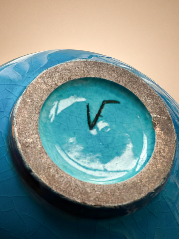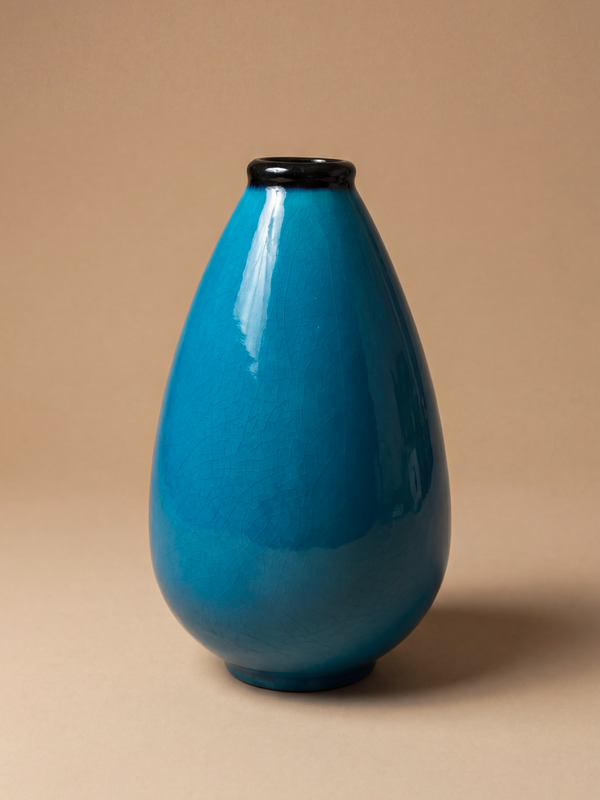This Primavera modernist vase, produced in France around 1924–1925, belongs to the wave of decorative renewal led by the Primavera workshop in the mid-1920s. Its balanced ovoid silhouette reflects the period’s pursuit of purified forms combined with a strong sculptural presence, firmly anchored in the emerging modernist language of the interwar years. The ceramic body is covered with a deep Egyptian blue / Persian turquoise glaze, enlivened by a fine craquelure network that subtly catches the light. The contrast between the luminous surface and the darker, slightly flared rim enhances the vertical tension of the form. This refined chromatic research is characteristic of Primavera and resonates with the contemporary explorations of ceramists such as Lachenal, Cazaux, or Rueland. Signed beneath the base, the vase clearly attests to its Primavera origin. Both decorative and sculptural, it exemplifies the ambition of these interwar productions: to create objects that are accessible yet demanding, where formal modernity, technical mastery, and the expressive richness of glaze converge into a coherent artistic statement.