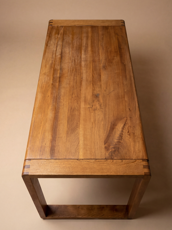 This desk stands out for its approach to solid wood furniture, both minimalist and warm. The elm, with its rich tones and expressive grain, is showcased with great mastery. The structure, with its clean and perfectly balanced lines, rests on open frame legs that give it a remarkable visual lightness. The careful joinery and softened edges reflect a precise and demanding craftsmanship. Featuring two discreet drawers integrated into the front, it combines functionality with elegance. Published by Galerie l’Orme, this desk embodies a timeless design, at once restrained, architectural, and deeply refined.