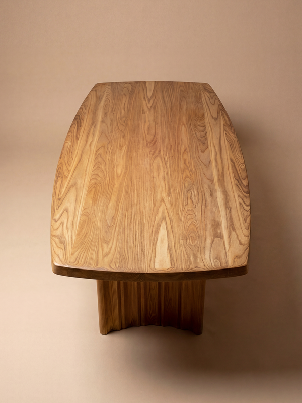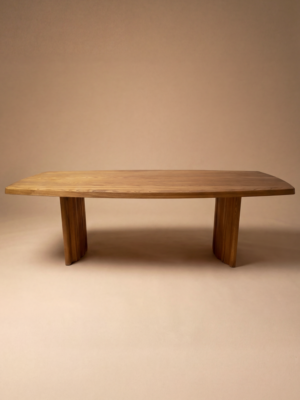 This large elm table, produced in France around 1980 by Ébénisterie Seltz, reflects the manufacturer’s commitment to rigorous craftsmanship and understated design. With its generous 225 cm length, the piece asserts a strong architectural presence while remaining firmly rooted in a tradition of functional, well-balanced furniture. The thick solid-elm top is softly contoured, its gently rounded edges highlighting the natural movement of the wood. From above, the tabletop reveals a continuous, carefully composed grain, demonstrating the quality of the selected elm and the precision of its execution. The table rests on two solid pedestal legs, vertically fluted and subtly curved at the base. This measured dialogue between mass and softness lends the piece both stability and visual lightness, characteristic of Ébénisterie Seltz’s high-end production in the late twentieth century.