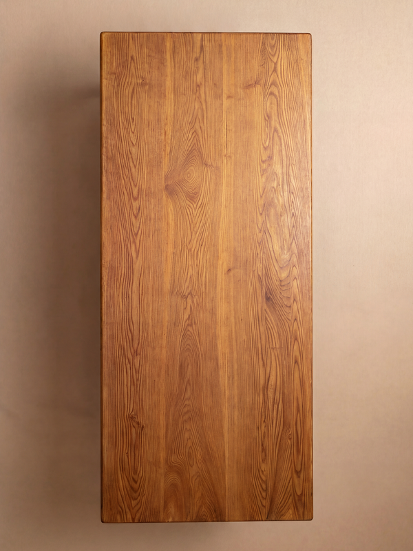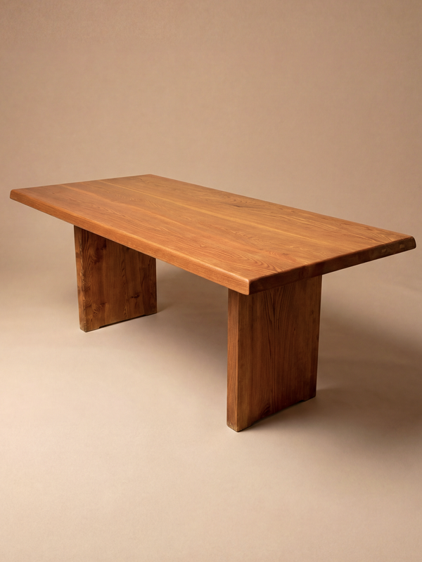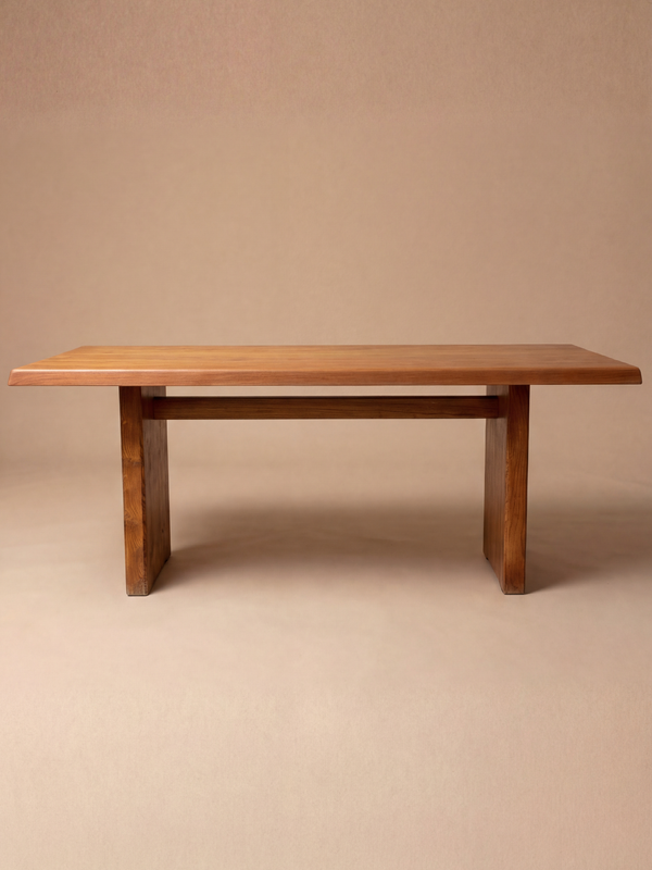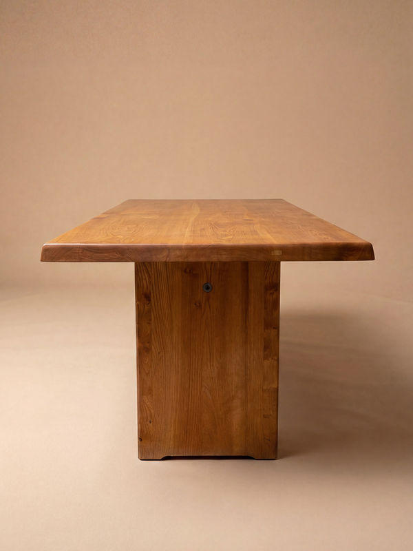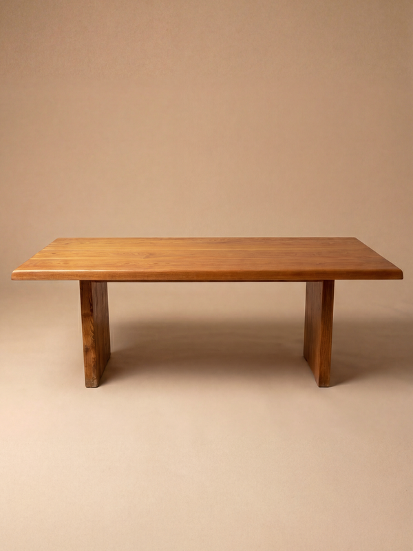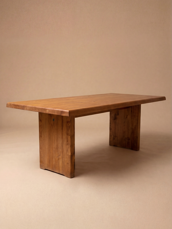 This Table T14C by Pierre Chapo exemplifies the designer’s radical approach to construction, where structure, material, and proportion are inseparable. Designed as a dining table of architectural clarity, it is defined by a thick solid-wood top resting on powerful slab legs, asserting a calm yet monumental presence. The design is deliberately reduced to essentials. Broad planes, precise joinery, and the absence of decorative excess allow the natural grain of the wood to take center stage. The slightly chamfered edges soften the geometry, while the visible assemblies express Chapo’s commitment to honesty of construction and material integrity. Viewed from any angle, the table reads as a functional object and a sculptural form. Its balance between mass and restraint, combined with impeccable craftsmanship, places it firmly within the lineage of French postwar modernism. A timeless piece, conceived for daily use yet endowed with enduring architectural strength.