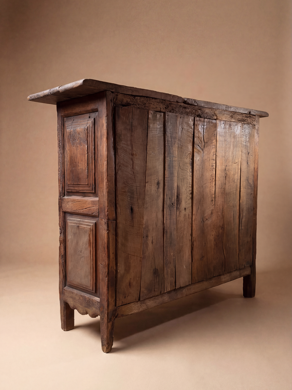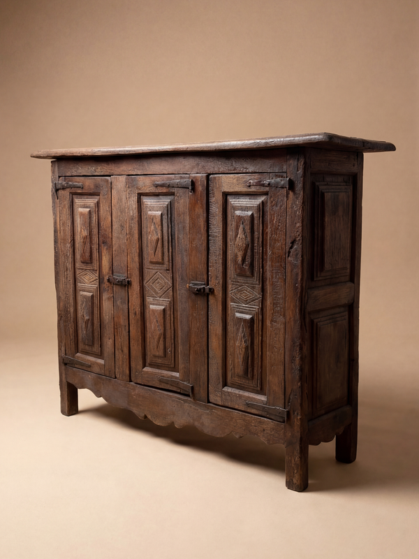 This oak sideboard embodies the expressive simplicity of 19th-century French rural furniture. Its four-door façade is enriched with carved panels featuring geometric motifs, both naive and deeply rooted in vernacular tradition. The wrought iron hardware, with its raw and utilitarian forms, enhances the authenticity of the piece. The wood, shaped by time, reveals a dense and vibrant patina, with rich brown tones, wear and irregularities that speak of daily use. The wide top, slightly warped, retains the marks of domestic life, giving the piece an almost tactile presence. Both functional and sculptural, this piece carries a sincere and timeless presence, where the hand of the maker remains visible in every detail.